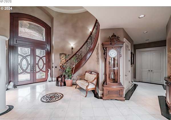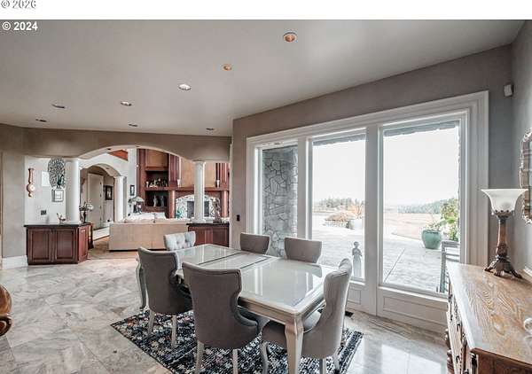 Luxurious Estate with Breathtaking Mountain Views! This spectacular 5-bedroom, 7 full and 2 half-bath estate offers unmatched elegance across 11,000+ sq. ft. Nestled in a stunning setting on 32 acres, it's a dream home for those seeking luxury and comfort. Enter through a grand foyer with towering ceilings and tile floors, setting the stage for the impressive interior. The chef's kitchen with a spacious butler pantry is designed for culinary enthusiasts, while the 6+ car garage and large shop provide ample space for projects and storage. Enjoy hosting in the light-filled main living room, featuring a beautiful fireplace, mantle, and built-ins. The family room features wet bar and dedicated movie theater, perfect for entertaining. Choose from two formal dining rooms for memorable meals with family and friends. A secret door leads to a hidden cellar with a private bathroom, offering a unique, intimate gathering space. Outdoors, the expansive patio features a cozy fireplace and built-in BBQ, while the fenced sport court with a basketball hoop promises endless fun. Retreat to the luxurious master suite, complete with a fireplace, sitting area, luxury shower, large jacuzzi tub, and his & hers walk-in closets and restrooms. Each of the three upstairs bedrooms has an ensuite bathroom, with access to two balconies through either the third bedroom or the study. The estate also includes a workout room with mirrors and a spacious bonus playroom. With every luxury and convenience, this estate combines sophistication with practical elegance.