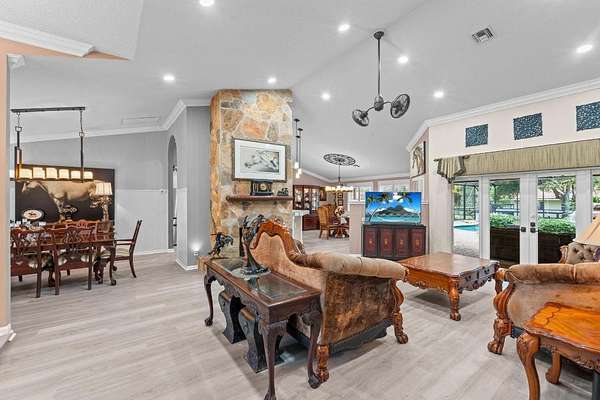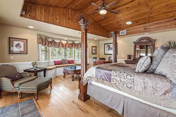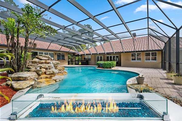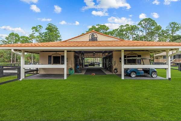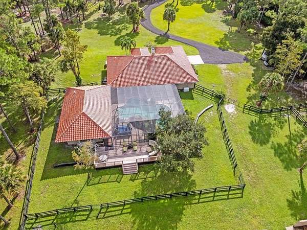 Are you prepared to chase your equestrian aspirations? Here lies a gated equestrian estate with fully equipped guest cottage situated on 5 full acres in the desired community of Deer Run, offering all the amenities of the equestrian lifestyle complete with a luxurious swimming pool. The pool is protected by commercial-grade screening which allows you to relish summer evenings shielded from the elements. The pool features landings beneath a stunning waterfall, reminiscent of resort-style living. A newly resurfaced asphalt driveway provides a smooth approach to your home. Additionally, both houses boast a newly installed Barcelona barrel tile roof. Upon entering through the new high-end hurricane impact double doors, you are greeted by vaulted ceilings and a Riverstone fireplace, perfect for warming up during those rare chilly Florida nights. Crown molding adorns every room. The kitchen is equipped with new countertops and stainless-steel appliances, ideal for crafting exquisite meals and hosting gatherings. This residence includes a full farm generator with an oversized 1500-gallon propane tank buried for convenient access. Do not underestimate the necessity of power and water in the event of an outage! The dryer and three fire pits are powered by the home propane. There is ample space to add and connect an outdoor kitchen! The main house features a split floor plan, ensuring privacy for both you and your guests. A new HVAC system installed in 2025. The property also includes a double reverse osmosis water system with a liquid peroxidation The guest house measures 1100 square feet, suitable for guests or generating additional income year-round or seasonally. Or multi-generational living. It is fully self-sufficient, equipped with impact windows. The 2022 barn features a new Bora Steel Tile barrel roof rated for 225 mph winds and includes five stalls, each 12 x 12, with matted flooring and water dispensers in every stall. Additionally, there is a tack room furnished with a washer and dryer, refrigerator, mop sink, tankless hot water heater, and feed room. The barn has four bays, one of which has hot water. Two stalls are equipped with run-out paddocks, and there is covered storage for hay.