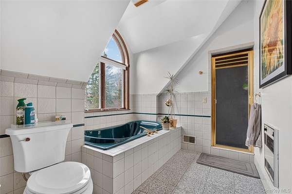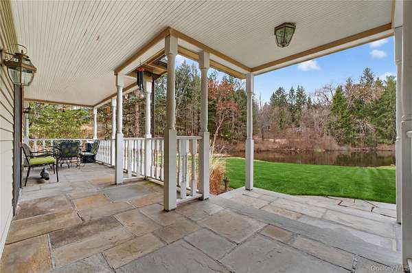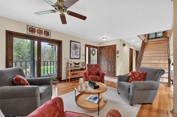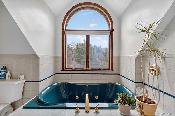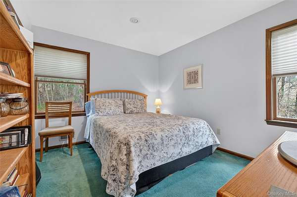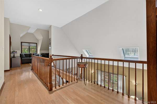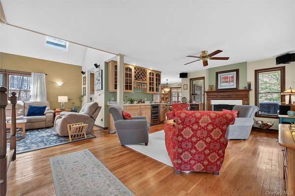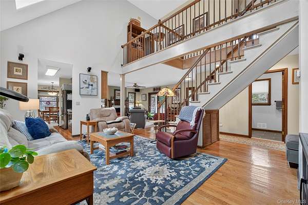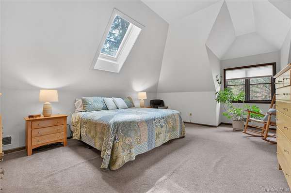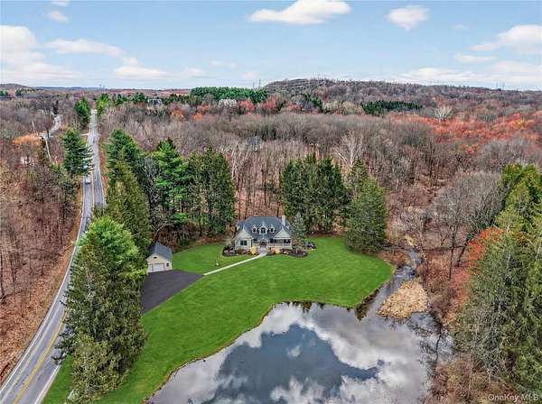 Private 2.43 acre retreat with a scenic pond setting. This 3 bedroom plus loft, 2.5 bath contemporary home offers a unique blend of architectural design and everyday comfort. A wraparound porch with flagstone flooring welcomes you in, while the copper exterior adds warmth and character that fits beautifully into the natural surroundings. Inside, the home is filled with light from expansive windows and features soaring vaulted and cathedral ceilings that create an open, airy feel throughout. The main level offers a spacious living room with a fireplace, complete with a wet bar and wine fridge, along with a dining area, galley kitchen, two bedrooms, a full bath, and a half bath with laundry. A blend of hardwood, carpet, and ceramic tile flooring adds warmth, texture, and durability throughout. Upstairs, the primary suite feels like its own retreat with vaulted ceilings, skylights, a walk in closet, and a spa inspired bath with a whirlpool tub. The loft space adds flexibility for a home office, sitting area, or guest space, along with additional storage. Additional features include central air, central vacuum, French doors, and generous closet space. Step outside to take in the peaceful pond views, relax in the hot tub, and enjoy the privacy of this beautifully landscaped property. A special home that offers both design and a true sense of escape.
