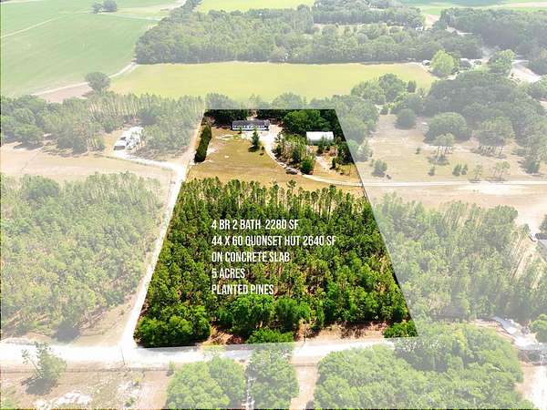 Country Living, Bell, FL. Potential Mini Farm. Fully fenced 5-acre property features a spacious 2,280 sq ft mobile home with a concrete foundation. Home is set on a sloped hill, overlooking pasture, dotted trees, and 1/4 of the acreage is mature pine trees, offering a peaceful and scenic rural setting with plenty of room to roam. A standout feature of the property is the impressive 44x60 Quonset Hut, built on a concrete slab--with interior framing and walls in place for a two-story apartment and loft with 2 sets of stairs. Ideal for use as a workshop, gym, equipment storage, or business space. With some creativity and the proper approvals, it also presents potential for conversion into a separate living area--perfect for multigenerational living, guest accommodations, caretaker, or use as a short-term rental (Airbnb). All such uses are subject to County zoning regulations and permitting requirements. Located just off NW County Road 340, this property offers convenient access to Bell, Trenton, High Springs, Branford, Gainesville, the Santa Fe and Suwannee Rivers, and many freshwater springs. Whether you're looking for a homestead, investment opportunity, or a blend of residential and functional land use, this versatile North Florida property is full of potential!