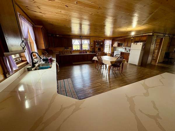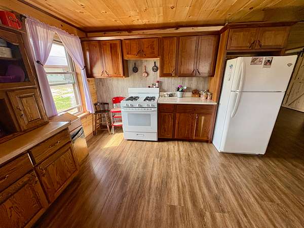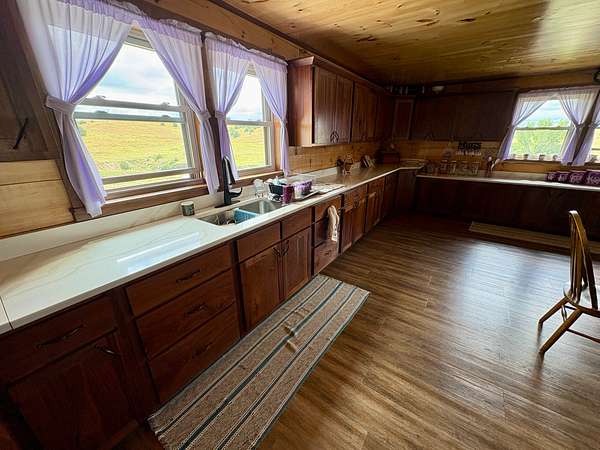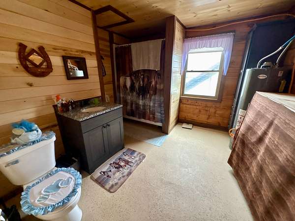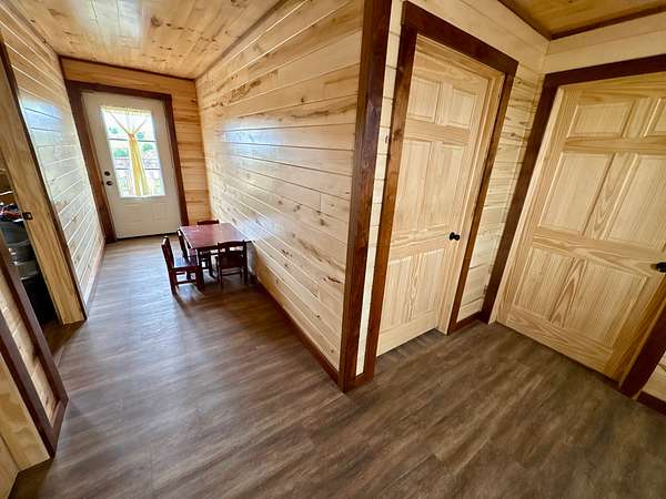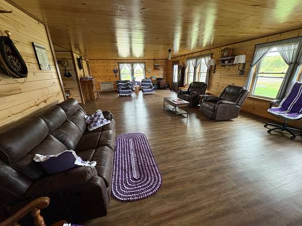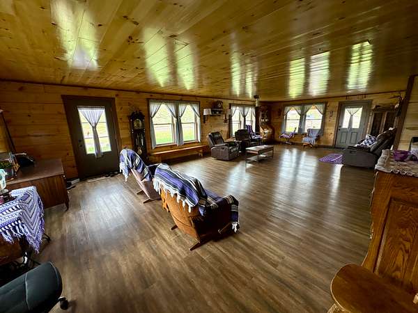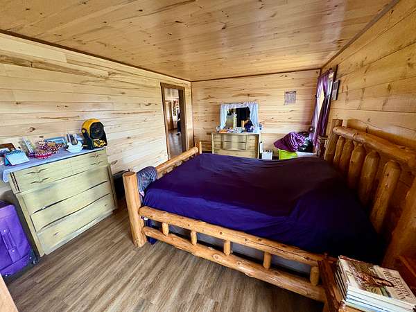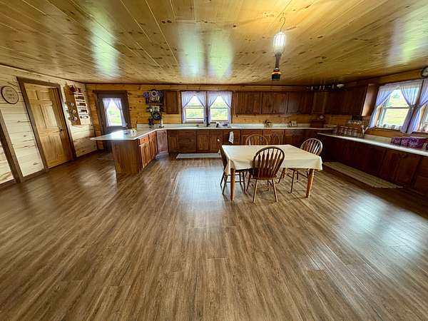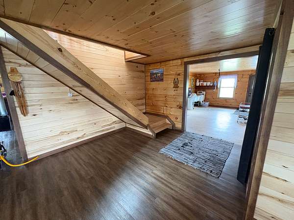 The centerpiece of the property is a beautifully handcrafted 3,504 sq. ft. log home, built in 2022 with squared, milled logs and a durable metal roof. Many of the home's wood features were custom-built from trees harvested directly on the land, giving it a true sense of place and authenticity. The house is thoughtfully positioned on a hill for excellent drainage and takes full advantage of the scenic surroundings. Inside, the main floor includes two spacious bedrooms and two bathrooms, including a primary suite, plus a mudroom. The upper level features three additional bedrooms and one bathroom. Quality, double-hung windows with full screens and blown-in attic insulation (2 feet in the first story, 3 feet in the second) provide both comfort and efficiency.