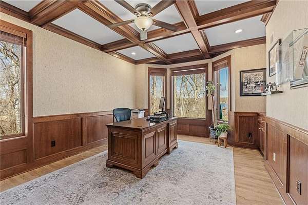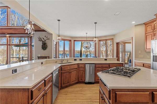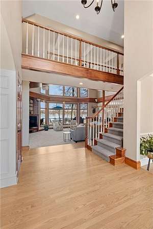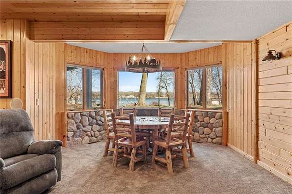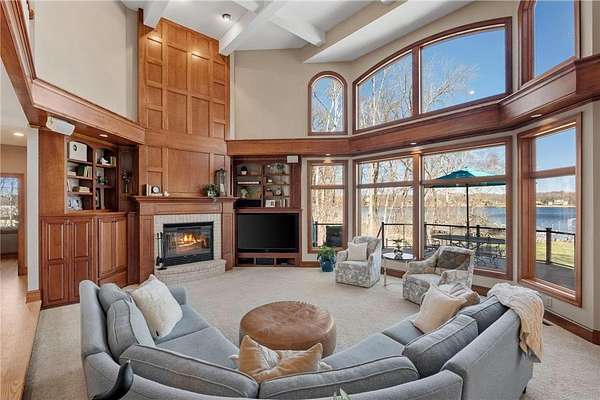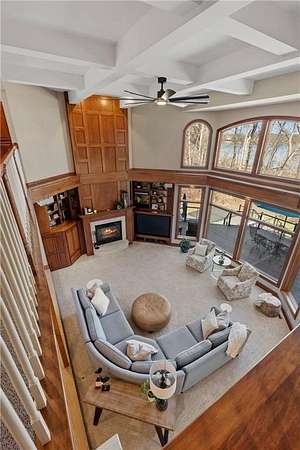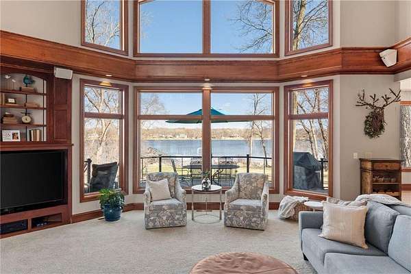 Upon entry, you are immediately drawn to breathtaking lake views framed by soaring ceilings and expansive windows that flood the home with natural light. Rich in character and craftsmanship, the home showcases stunning cherry and oak woodwork, with custom trim and flooring milled from trees harvested right from the property an exceptional and rare detail.