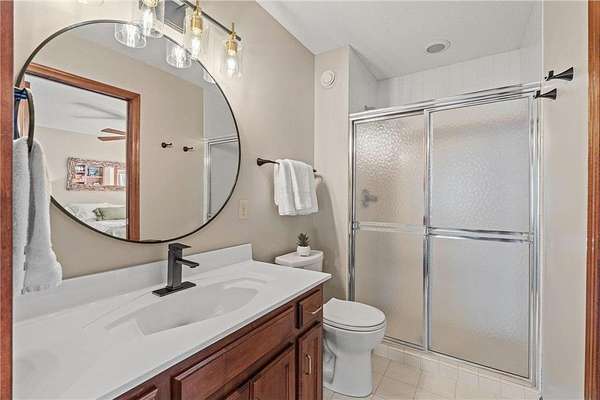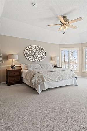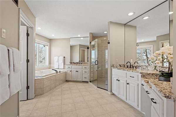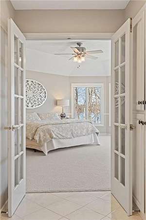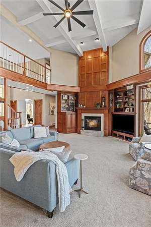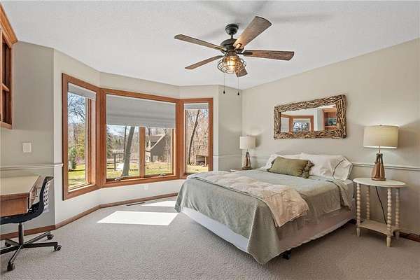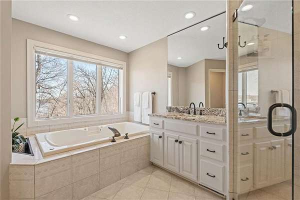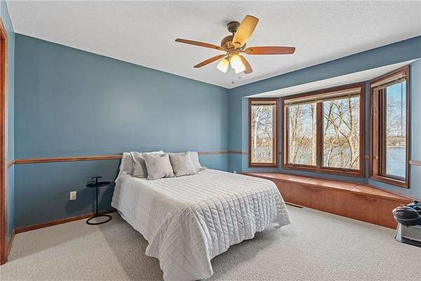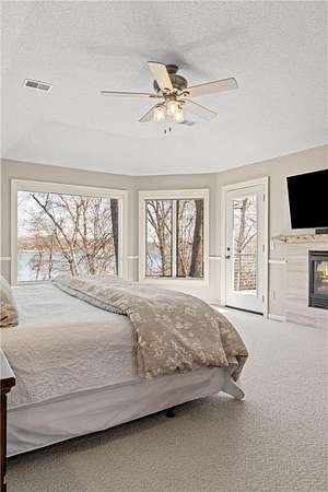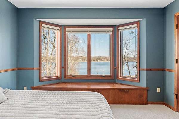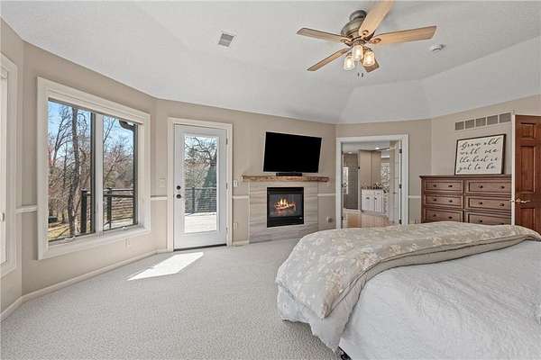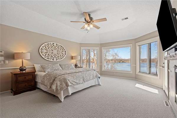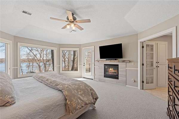 The lake-facing primary suite is a private retreat, complete with its own fireplace, access to a private deck, and serene water views. The spacious en-suite bath and generous walk-in closet complete this luxurious sanctuary.