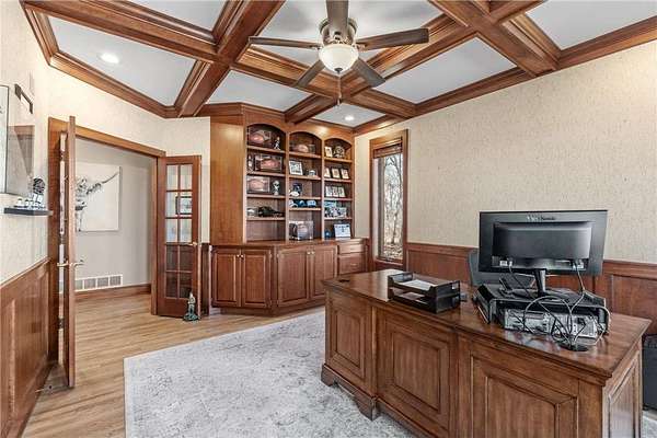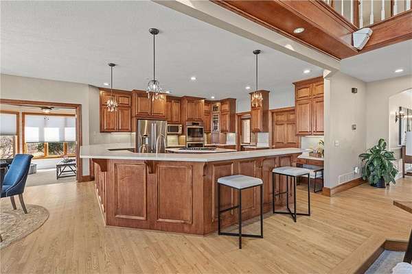The main level offers an open-concept design with refined finishes throughout. The gourmet kitchen has been thoughtfully updated with new quartz countertops, high-end appliances, and generous workspace perfect for both everyday living and entertaining. A beautifully appointed main floor office features exquisite wood detailing, while the spacious laundry room is designed for function and convenience with dual washers, dual dryers, and abundant storage.