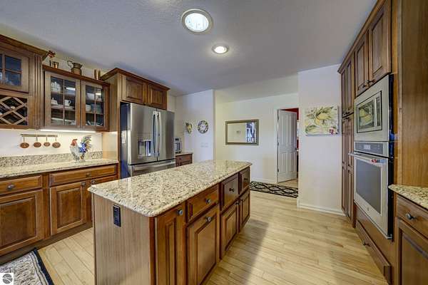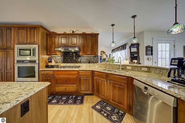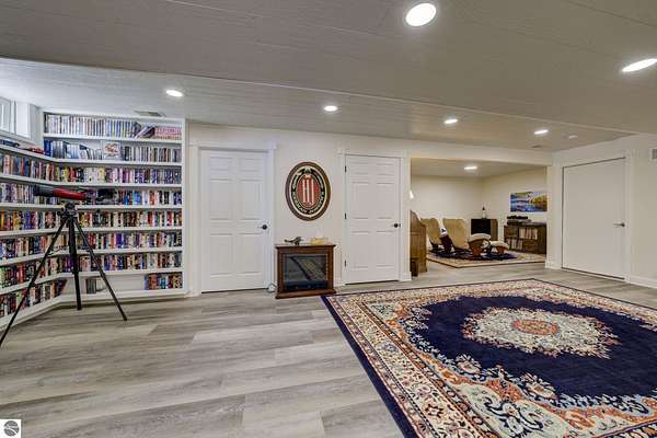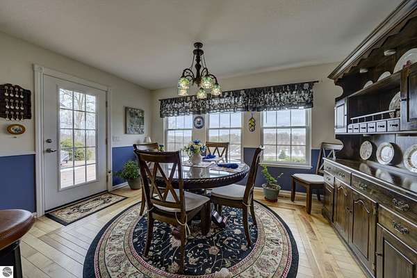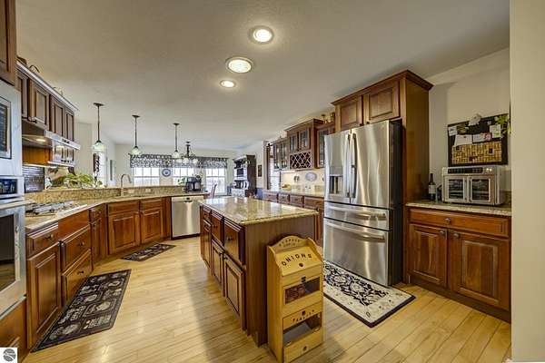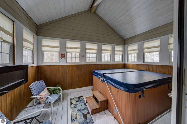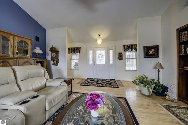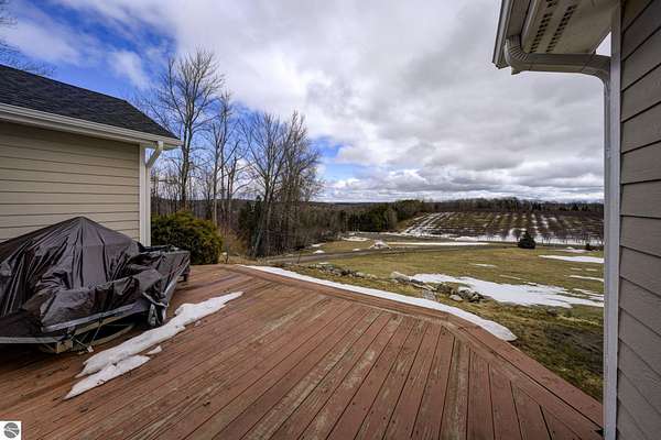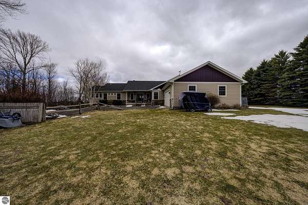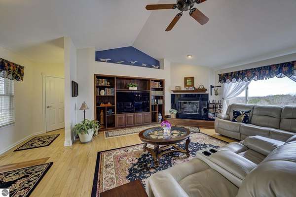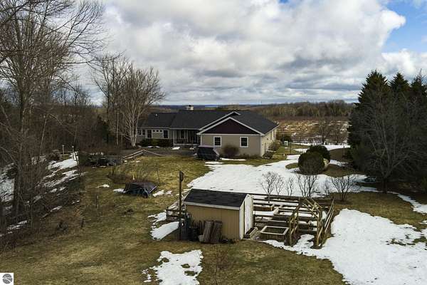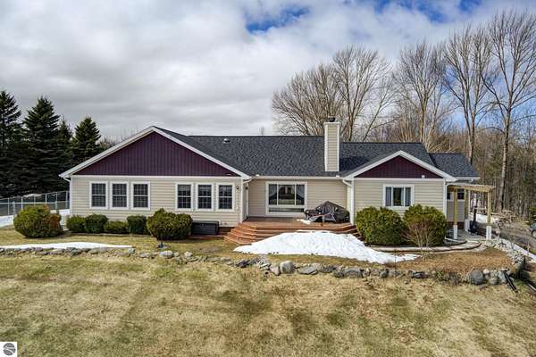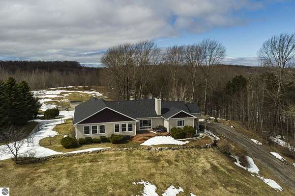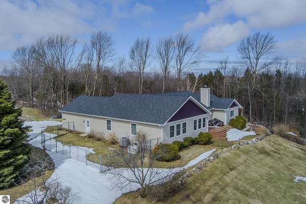 Set on 5.19 private acres in the heart of Leelanau County, this beautifully maintained 3-bedroom, 2.5-bath home offers the perfect blend of comfort, space, and lifestyle. Surrounded by a peaceful blend of mature deciduous trees and rolling countryside, this property provides both privacy and convenience just north of Suttons Bay. The main level features well-defined living spaces that provide both comfort and functionality, with maple hardwood floors throughout the kitchen, living, and dining areas. The spacious kitchen is designed for both everyday living and entertaining, complete with granite countertops, newer appliances, and a large center island. A library or office on the main floor offers a quiet and functional work-from-home space, while the remodeled laundry room includes built-in beverage refrigerators for added convenience. Multiple living areas—including a cozy fireplace living room and a finished lower level with home theater and recreation space—offer flexibility for socializing, relaxing, reading, crafting, or movie nights. The main floor primary suite serves as a private retreat with a soaking tub, double-head tile shower, and two walk-in closets, and also offers direct access to the hot tub room, creating a true spa-like experience. The dedicated hot tub room provides year-round relaxation.This home has been thoughtfully updated with newer appliances, a newer roof (approximately 3 years), and numerous improvements throughout, along with the added benefit of a whole-home generator for peace of mind. Outdoor features include beautifully landscaped grounds, garden areas, and a fenced vegetable garden with raised beds, creating an ideal setting to enjoy Northern Michigan living. A rare opportunity to own a spacious, amenity-rich home on acreage in a highly desirable Leelanau location, offering privacy, versatility, and room to live, relax, and entertain. Furnishings and equipment for the movie room are included in the sale.