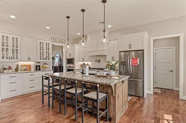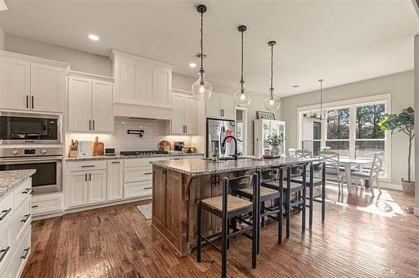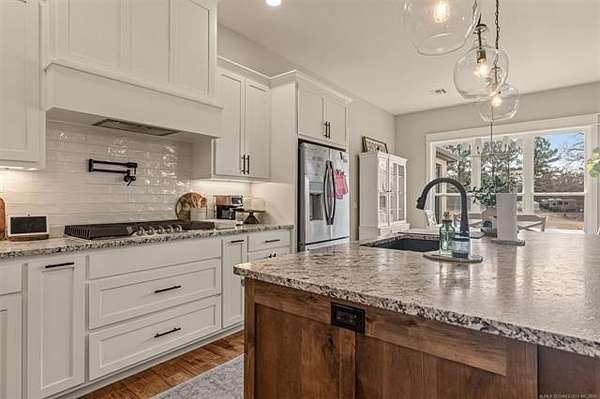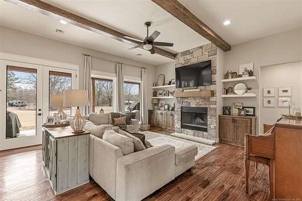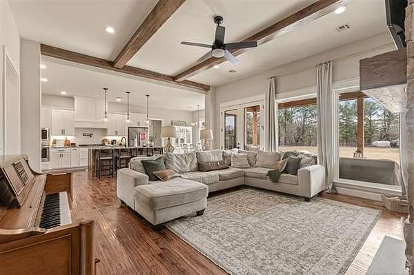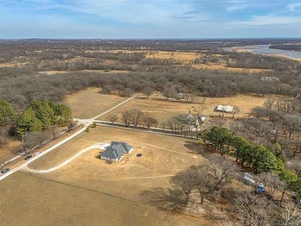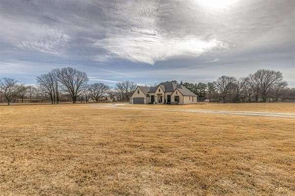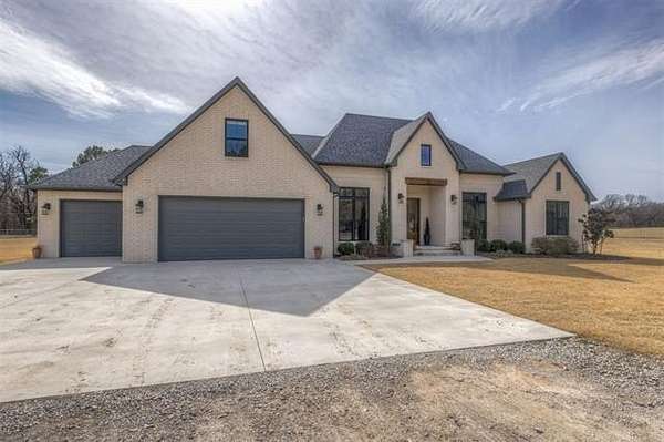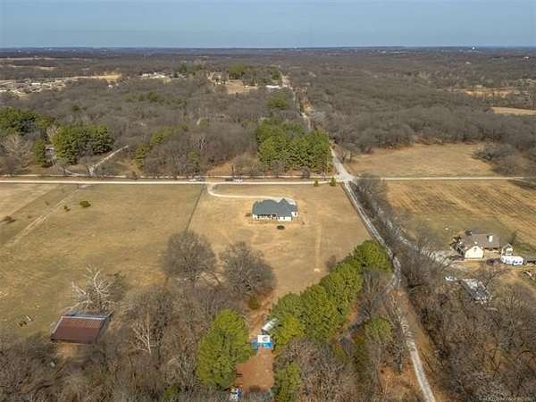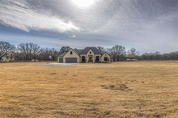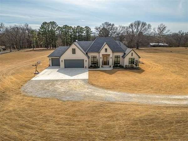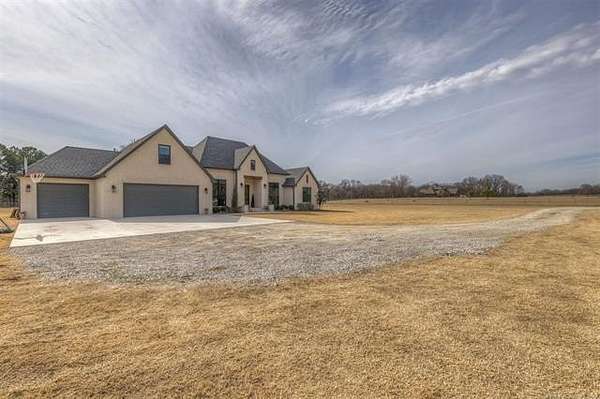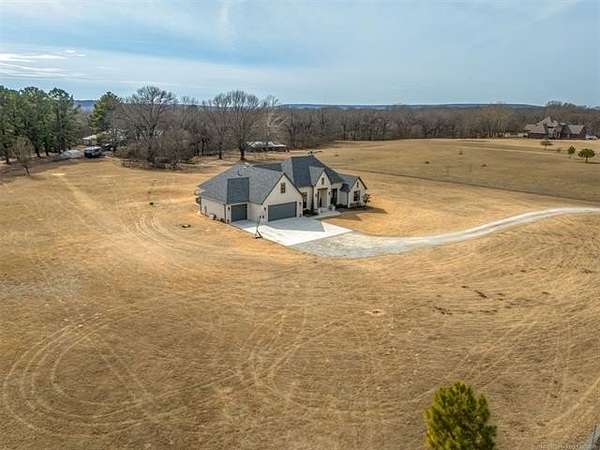 Welcome to this stunning, like-new modern farmhouse, custom-built on a private 3.65 acre corner lot in the desirable Sandhill area of Coweta. Thoughtfully designed and meticulously crafted for a forever home, this 5-bedroom, 4-bathroom residence offers the perfectblend of luxury, functionality, and peaceful country living - just 30 minutes from downtown Tulsa. Step inside to hand-scraped solidoak floors that flow throughout the open-concept living spaces. The gourmet kitchen is a chef's dream, featuring Sedona leatheredgranite countertops, soft-close cabinetry with under-cabinet lighting, a gas range with pot filler, and beautiful hickory-stained accentbeams that add warmth and character. A formal dining area and expansive living room with a wood-burning fireplace creates aninviting space for family gatherings and entertaining. The primary suite is a true retreat with a spa-like bathroom complete withaccent lighting and heated towel rack. Additional bedrooms offer flexibility for growth, home office or guests and premium finisheselevate every detail. Outside the appeal is undeniable. An attached 3-car garage is fully insulated with hot/cold water - ideal for aworkshop or hobbies. Fully fenced grounds, where wildlife frequently visits, provides room for play, gardening, animals, or simply unwinding in nature. Built with quality and efficiency in mind, this home delivers low maintenance and comfort. New construction onacreage is rare, this exceptional property won't last long. Schedule your private tour today and experience the lifestyle you've beendreaming of.
