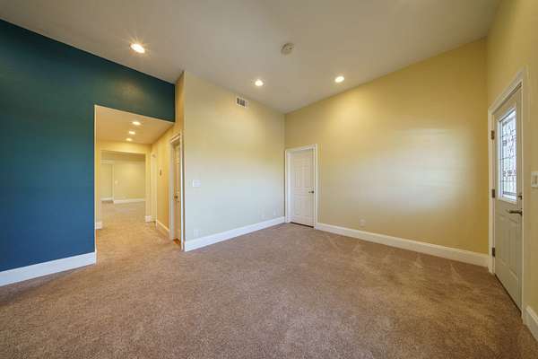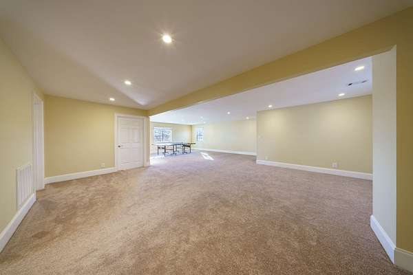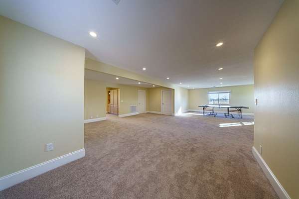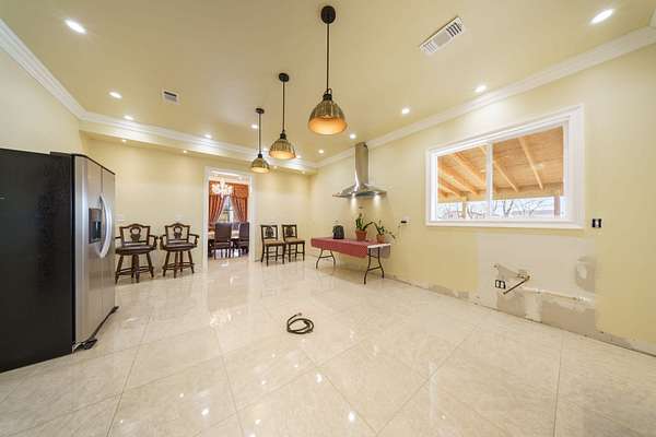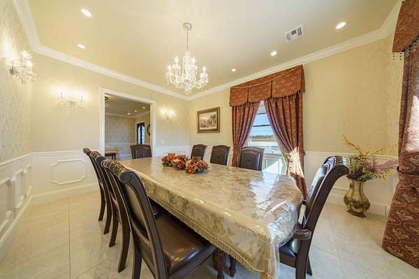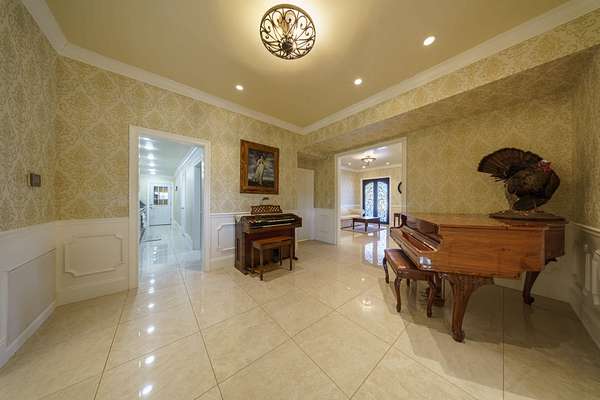 The main level offers elegant yet functional living spaces, including a spacious living room, formal dining room with crystal chandelier and sconces, and an additional open area perfect for a sitting room or office. The kitchen area is ready for customization, with electric and propane connections, island plugs, and a large walk-through pantry.