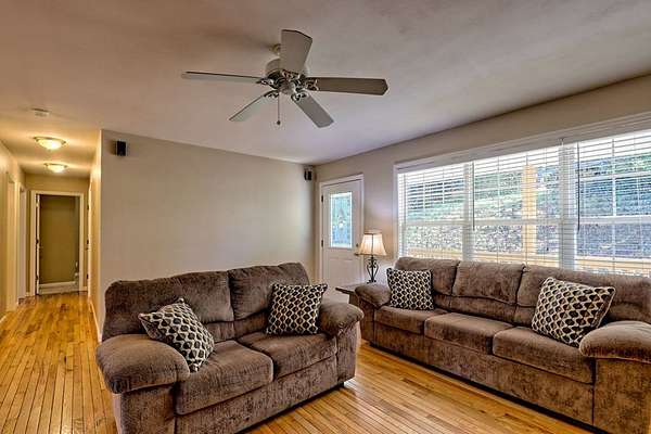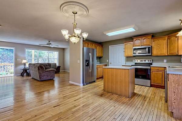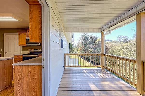Private 3BR/3BA tucked away on 3.97 acres with year-round Tusquittee mountain views with 600 ft of creek branch frontage running through the rear property line. The thoughtfully designed floor plan accommodates multigenerational living, featuring a fully finished terrace level. The main level offers a family room with a corner stacked stone fireplace, open to the kitchen with modern stainless-steel appliances and a dedicated dining area. French doors in the kitchen and primary bedroom lead to the rear deck, which overlooks the backyard. The primary bedroom includes its own bath, in addition to a secondary bedroom and bathroom all on the main level. The lower level presents a valuable opportunity, featuring versatile square footage that can accommodate your needs. An office nook with a custom-built-in desk, two bonus rooms, a full bath and bedroom, plus a convenient kitchenette equipped with a sink, small fridge, and microwave. A two-car garage, two-car metal carport, RV hook-up site, storage outbuilding, and an installed radon mitigation system lend to the features of this homestead. Step outside to discover a private backyard with large shade trees, a fenced area for your dog, and plenty of room for a garden by the creek branch. About a mile from downtown Hayesville Square, where you can enjoy all the local conveniences.
