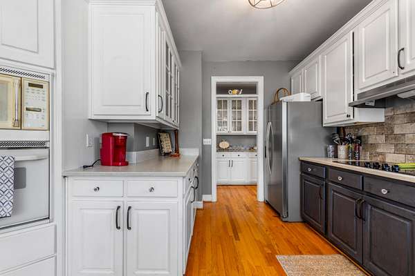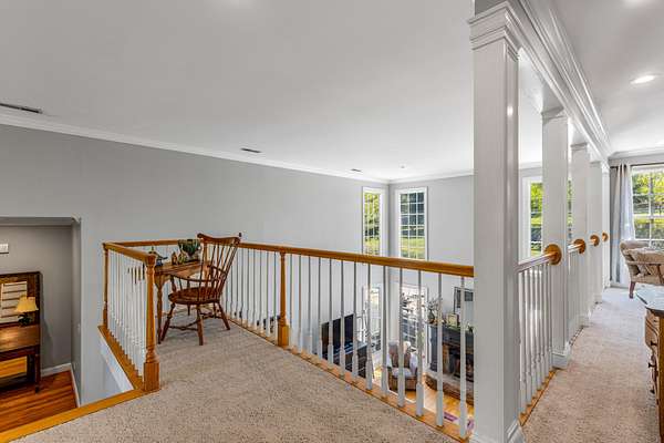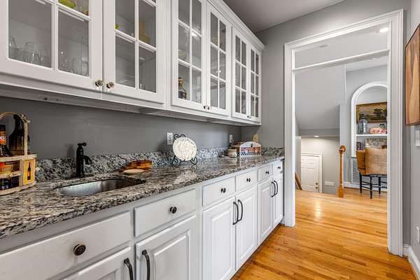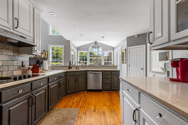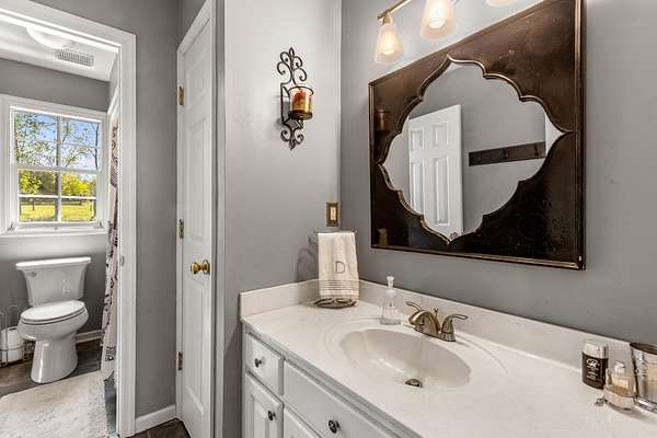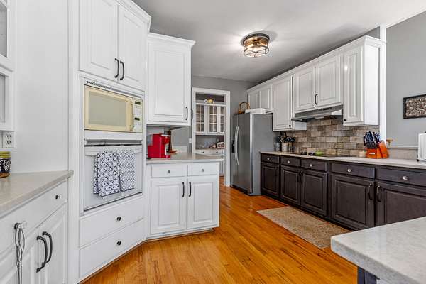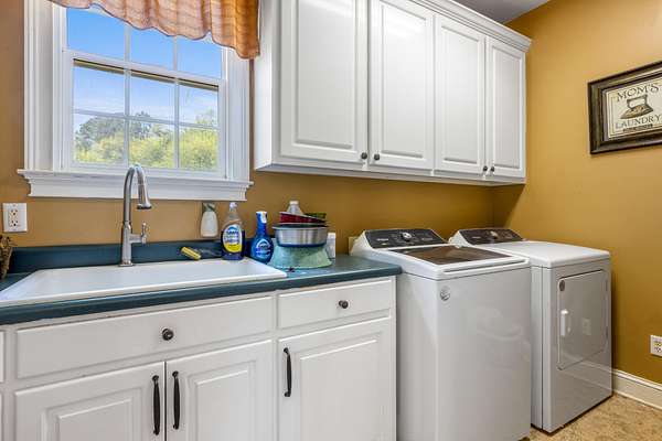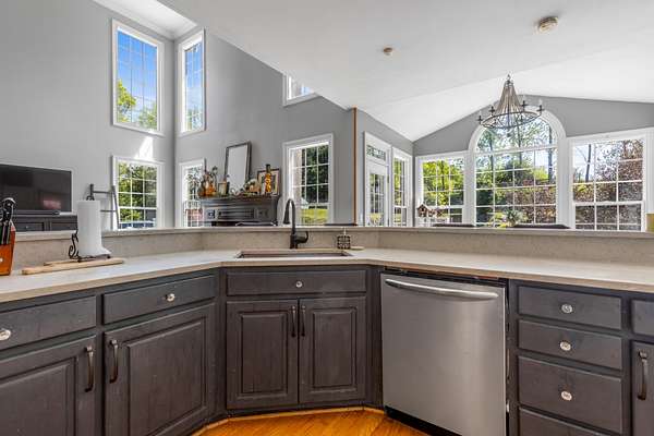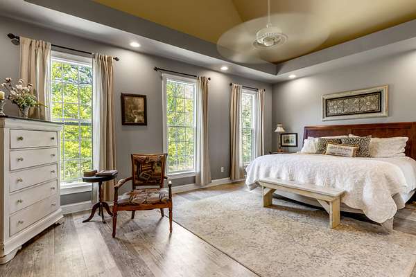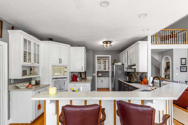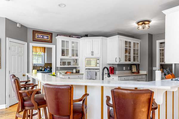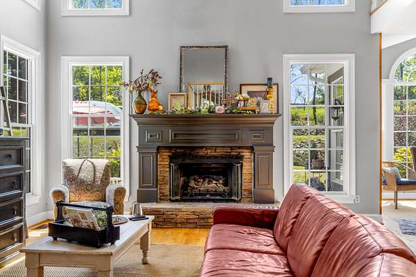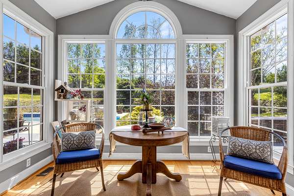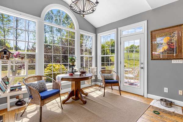 The spacious kitchen is designed for both everyday living and entertaining, featuring quartz countertops, a breakfast bar, abundant cabinetry, and a butler's pantry with granite countertops. A bright sunroom overlooks the property, offering the perfect place to relax and enjoy scenic views of the surrounding land.