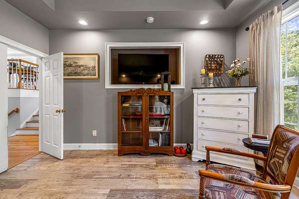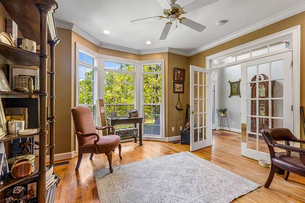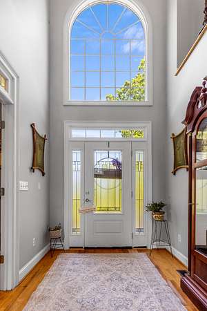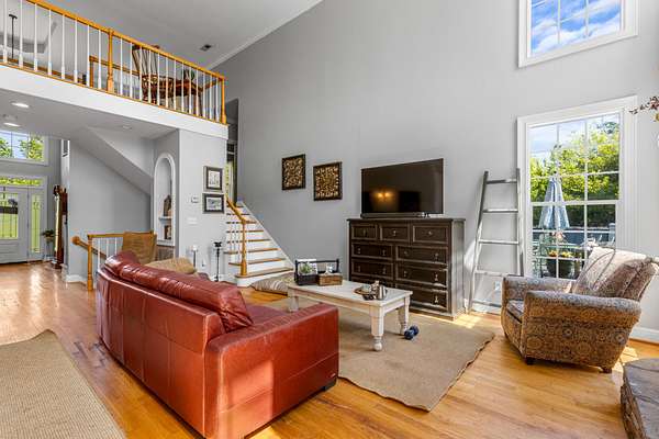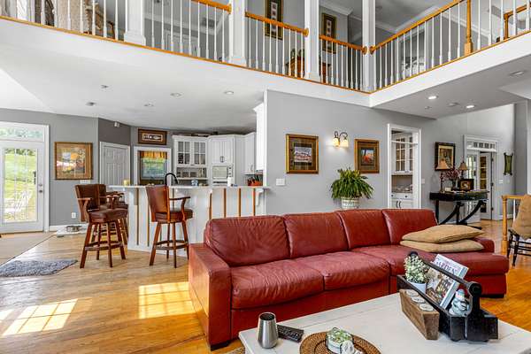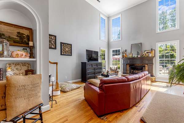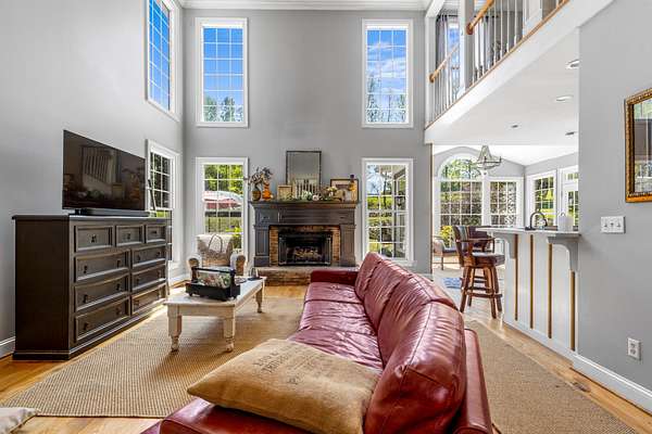 Step inside to a grand two-story foyer that opens into a light-filled living room with soaring ceilings, expansive windows, and a cozy gas fireplace. The main level features multiple living spaces, including a formal dining room and a private office or library with French doors--ideal for working from home or quiet retreat.