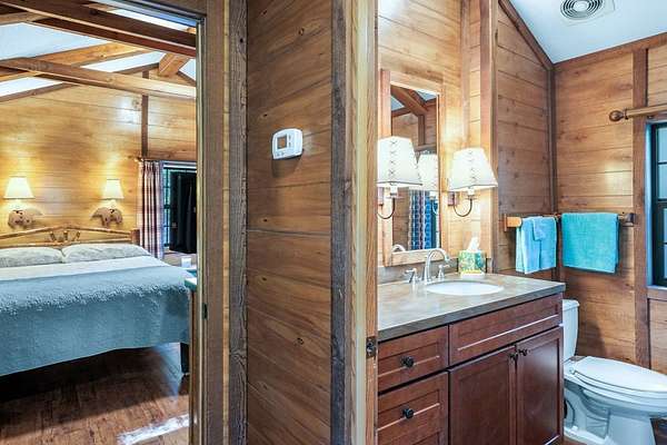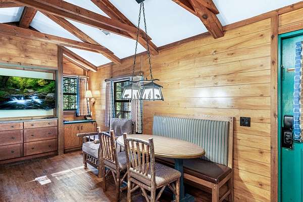 Craving simplicity without sacrifice? This charming 1-bedroom, 1-bath cabin delivers a rare blend of rustic character and real-world convenience. Originally the last home sold out of Walt Disney's Wilderness Lodge, it was carefully brought to this location, bringing with it a touch of magic and a story unlike any other. Set on 2.25 wooded acres just off the highway, it's a peaceful retreat with quick access to everything you need. Vaulted ceilings and rich wood finishes evoke warmth and authenticity, while a covered front porch and direct bedroom access invite seamless indoor-outdoor living. Surrounded by a canopy of vibrant trees in every lush season. Whether you're looking for a full-time escape or a weekend recharge, this is where comfort meets clarity.