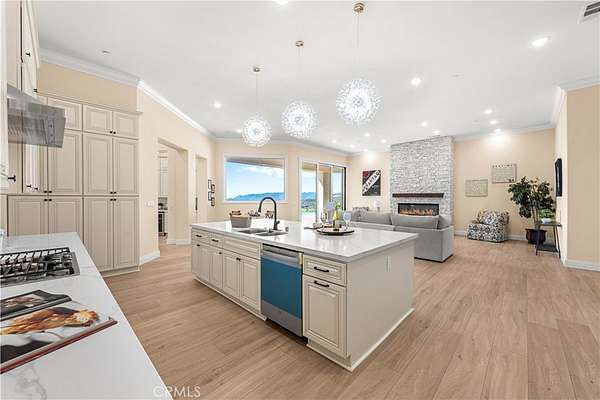 At the heart of the home lies the chef's kitchen, featuring custom cabinetry, double pantries, oversized center island, and premium finishes including soft-close drawers and shelving. Flowing seamlessly from the kitchen, the family room's oversized windows frame breathtaking hillside and golf course views, filling the space with natural light.