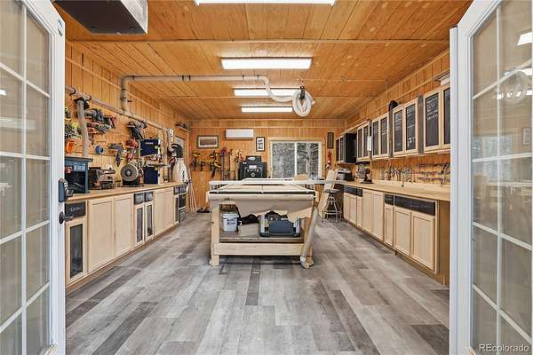 A standout feature of the property is the impressive ~2,000 sq ft detached bonus structure—perfectly suited for a home-based business, hobbyist, or collector. It includes a large office, a custom craftsman-designed woodshop, and three oversized bays with ample clearance for indoor trailer or equipment storage.
