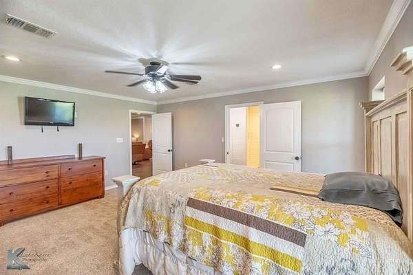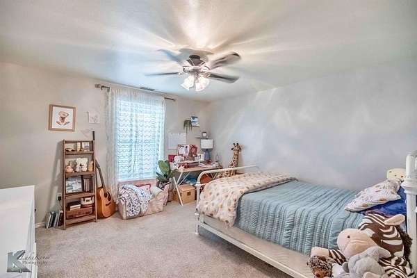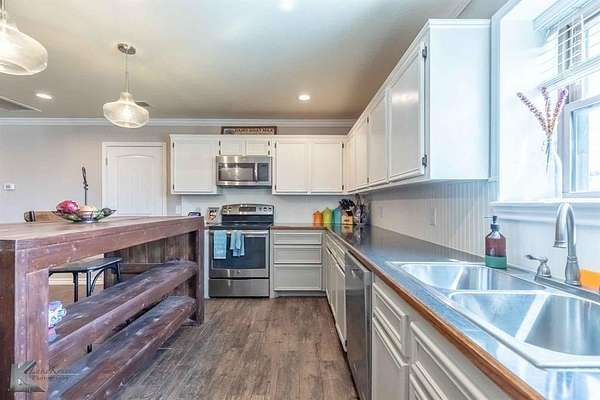 The property consists of fenced native pasture with level to sloping topography, typical for the area. Utilities include rural water and a septic system. Inside, find tile floors in the main areas and carpeted bedrooms. The entryway features shiplap walls and built-in storage. The kitchen is well-equipped with white cabinets, stainless appliances, and an island with seating. The dining area is spacious, and sliding barn doors offer flexible space. The primary bedroom includes convenient washer-dryer hookups.