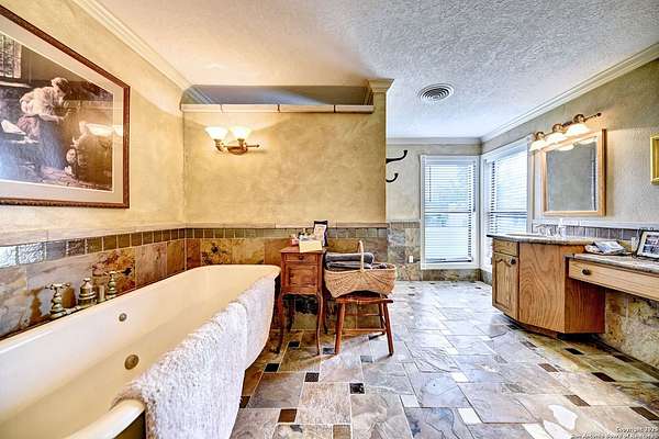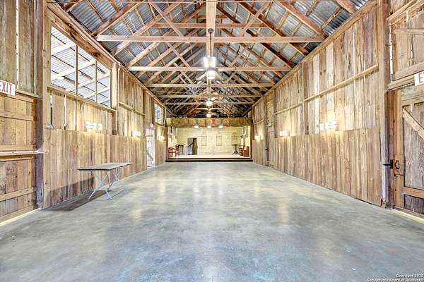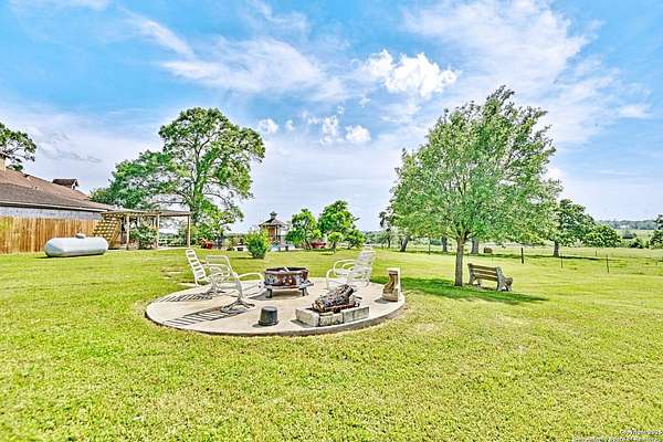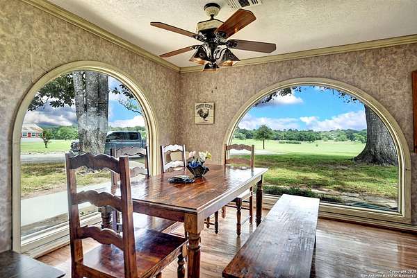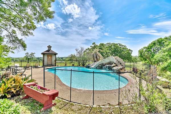 Escape to Southern tranquility on this picturesque 40+/- acre ranch retreat nestled amidst quiet, rolling grasslands. This versatile country estate offers a unique blend of charm and functionality, featuring a vintage red barn currently operating as an event venue, a stocked fishing pond, a chicken coop, multiple storage barns, and a paved sport court. The inviting two-story residence boasts a three-car garage, a balcony perfect for enjoying the views, and two cozy wood-burning fireplaces in the living and dining rooms. The rustic island kitchen flows seamlessly into the naturally lit dining area, creating a warm and inviting space. Step outside to your private oasis with a covered porch, a complete outdoor kitchen and grill area, and a sparkling pool featuring a delightful water feature and waterslide - ideal for relaxation and entertaining.