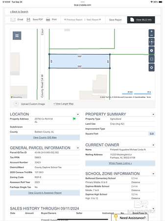 Est $4,898/moGreat investment, That needle in a hay stack...One of a kind location... Daphne/Belforest location..Zoned Rural Agriculture. Which allows storage facility. Has road frontage on CR 54 East and West. These 2 tracts total 13+- acres, with 69' +- on CR 54 West (PPIN 58803, 68979) The brand-new Elementary school is two blocks away. Water is Belforest Water. Baldwin County Sewer -Amazing home site, with potential commercial location. Family compound.. Now is the time to jump on this site. Geo tech report is attached in documents Buyer to verify all information during due diligence. New updated survey in file.