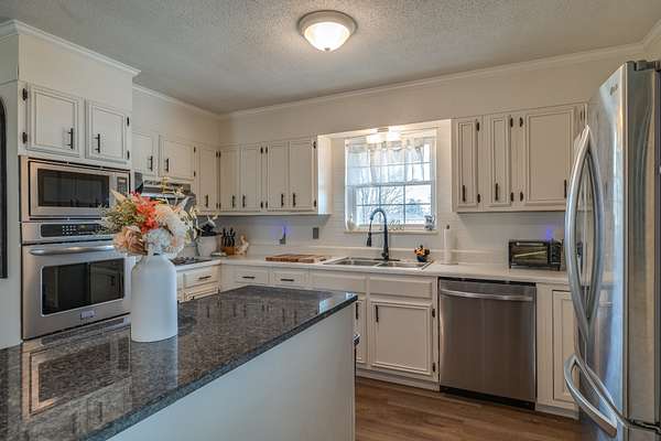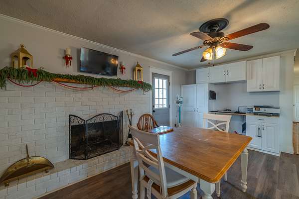 Step inside to find a spacious family/living room perfect for hosting family gatherings. The airy gourmet kitchen features solid surface countertops and stainless steel appliances, flowing effortlessly into the dining area, which is perfect for entertaining friends and family, complete with the cozy ambiance of a wood-burning fireplace.