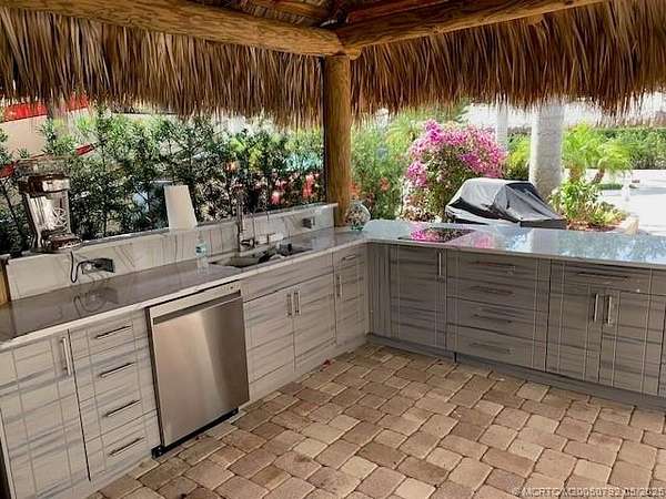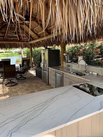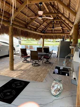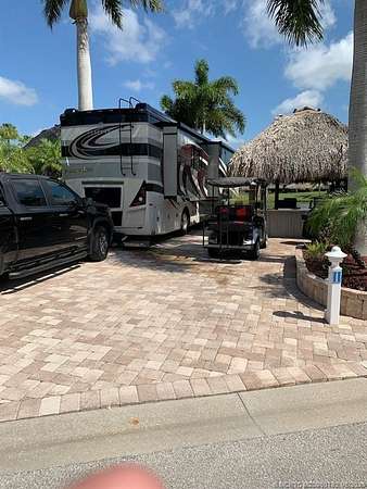 Prime Waterfront RV Lot on a Stunning Royal Palm-Lined Street. Welcome to one of the most beautiful locations in the resort! This exceptional lot is perfectly positioned along a picturesque, royal palm-lined street, offering sweeping views of a tranquil waterfall and breathtaking sunsets-an ideal setting for relaxing or entertaining in style. Designed for low-maintenance luxury, the entire lot is covered in elegant pavers, while raised landscape beds with mature plantings and vibrant bougainvillea provide a lush, private retreat. At the heart of the space is a spacious tiki, thoughtfully outfitted with upgraded, marine-grade cabinetry, a built-in cooktop, dishwasher, and full-size refrigerator-everything you need to enjoy seamless outdoor living. This property has been immaculately maintained and is move-in ready. Just bring your coach and start living the ultimate waterfront RV lifestyle today!
