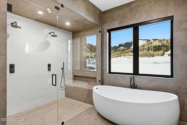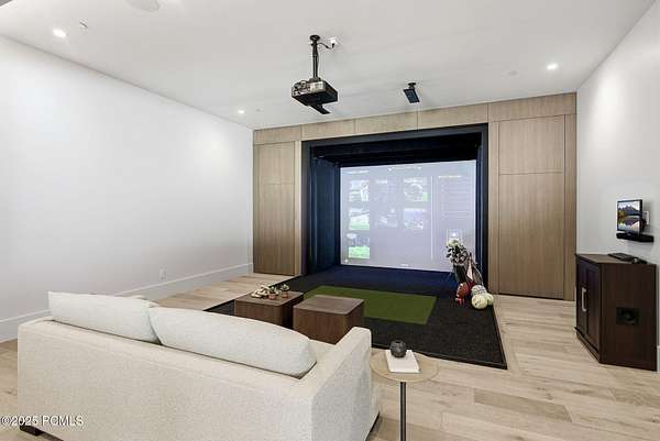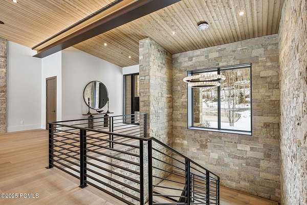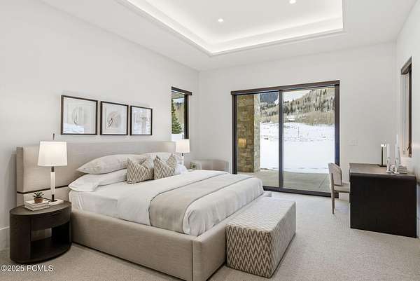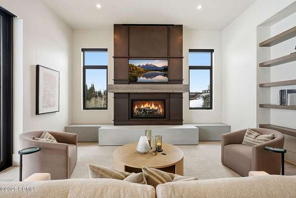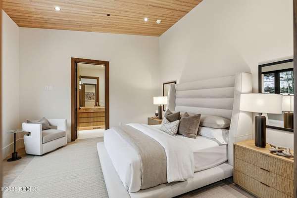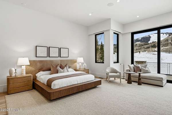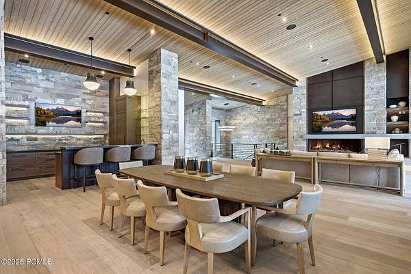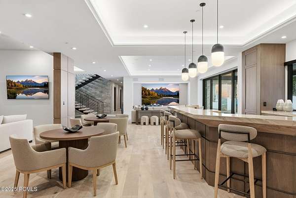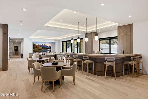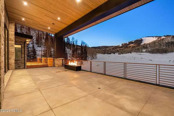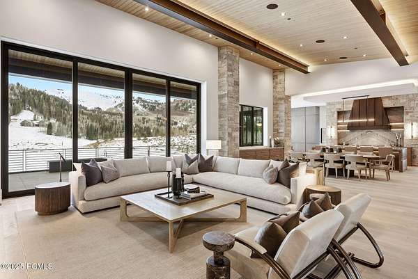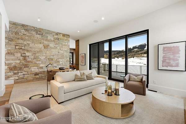 This newly completed estate sits on one of the premier homesites in Phase 5 of The Colony at White Pine, created by the community's most experienced development team. Gently sloping from White Pine Canyon Road, the residence is perfectly positioned at the edge of a meadow, capturing unobstructed views of West Monitor, No Name Bowl, and the Park City ridgeline. Spanning over 15,000 square feet, the home is thoughtfully designed with the primary living spaces and owner's suite on the main level. The floor plan strikes an ideal balance between grandeur and intimacy-equally suited for large gatherings or comfortable everyday living. The main level is anchored by a dramatic great room with soaring wood ceilings that opens to a spacious patio overlooking the meadow, Phase 5 ponds, and surrounding mountains. This level includes the main living area, chef's kitchen, bar, wine room, hearth room, ski room, primary suite, and two additional bedrooms, one of which functions perfectly as a home office. The lower level is dedicated to recreation and guest accommodations, featuring a large secondary living area with a full bar, Full Swing Multisport golf simulator, billiards, and a spa-inspired wellness retreat with gym, sauna, steam room, and treatment area. Five additional bedroom suites are located on this level, including two bunk rooms ideal for hosting family and friends. Finishes throughout the home are refined and timeless, featuring Montpellier oak distressed hardwood floors, rift oak cabinetry, natural stone accents, a bronze metal roof, cedar siding, and designer fixtures and hardware. A complete furniture package is included for a truly turnkey experience. Heated outdoor living spaces enhance year-round enjoyment, including a main-level deck with covered and open areas and an outdoor kitchen, a private patio off the primary suite, a heated ski patio with direct access to the ski run, and a lower-level covered patio that opens to a landscaped yard.