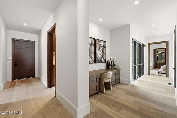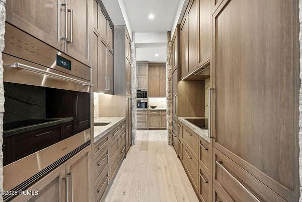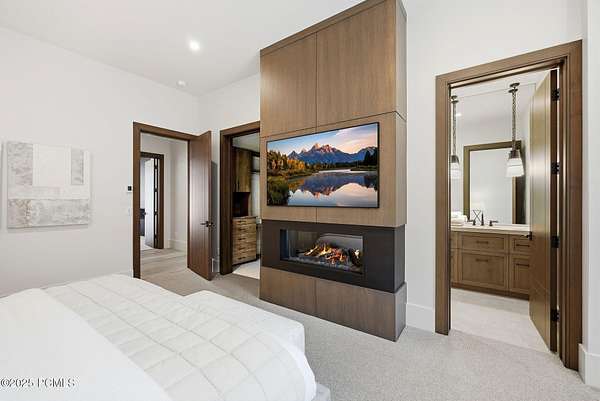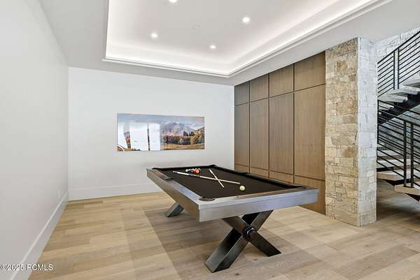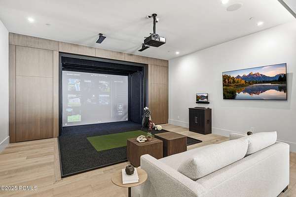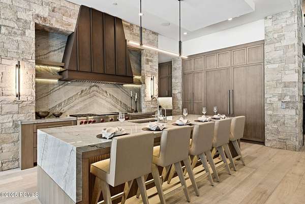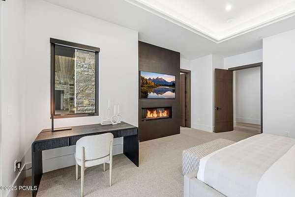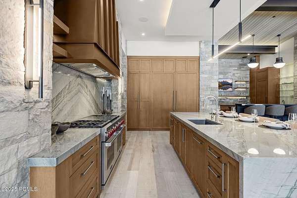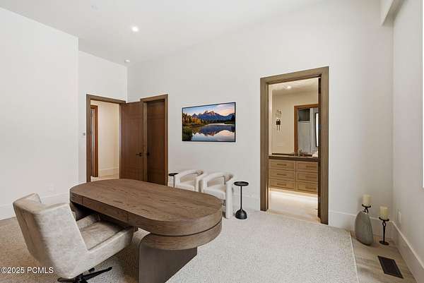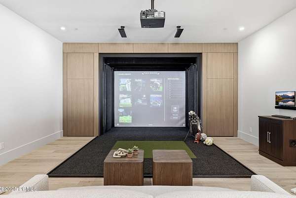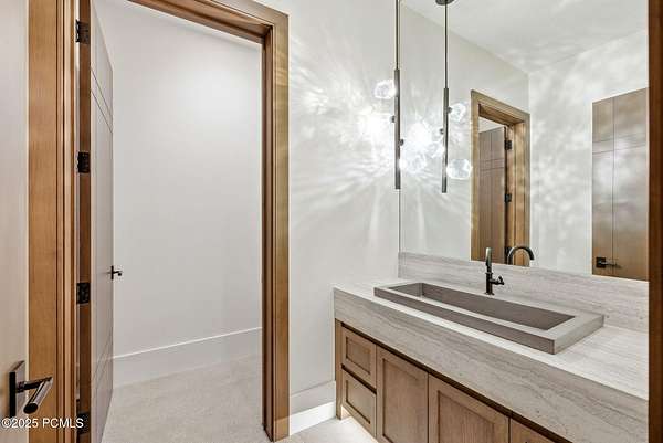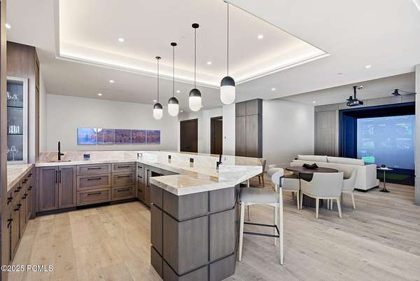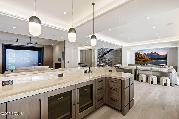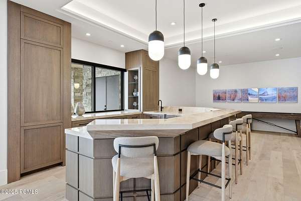 This newly completed estate sits on one of the premier homesites in Phase 5 of The Colony at White Pine, created by the community's most experienced development team. Gently sloping from White Pine Canyon Road, the residence is perfectly positioned at the edge of a meadow, capturing unobstructed views of West Monitor, No Name Bowl, and the Park City ridgeline. Spanning over 15,000 square feet, the home is thoughtfully designed with the primary living spaces and owner's suite on the main level. The floor plan strikes an ideal balance between grandeur and intimacy-equally suited for large gatherings or comfortable everyday living. The main level is anchored by a dramatic great room with soaring wood ceilings that opens to a spacious patio overlooking the meadow, Phase 5 ponds, and surrounding mountains. This level includes the main living area, chef's kitchen, bar, wine room, hearth room, ski room, primary suite, and two additional bedrooms, one of which functions perfectly as a home office. The lower level is dedicated to recreation and guest accommodations, featuring a large secondary living area with a full bar, Full Swing Multisport golf simulator, billiards, and a spa-inspired wellness retreat with gym, sauna, steam room, and treatment area. Five additional bedroom suites are located on this level, including two bunk rooms ideal for hosting family and friends. Finishes throughout the home are refined and timeless, featuring Montpellier oak distressed hardwood floors, rift oak cabinetry, natural stone accents, a bronze metal roof, cedar siding, and designer fixtures and hardware. A complete furniture package is included for a truly turnkey experience. Heated outdoor living spaces enhance year-round enjoyment, including a main-level deck with covered and open areas and an outdoor kitchen, a private patio off the primary suite, a heated ski patio with direct access to the ski run, and a lower-level covered patio that opens to a landscaped yard.
