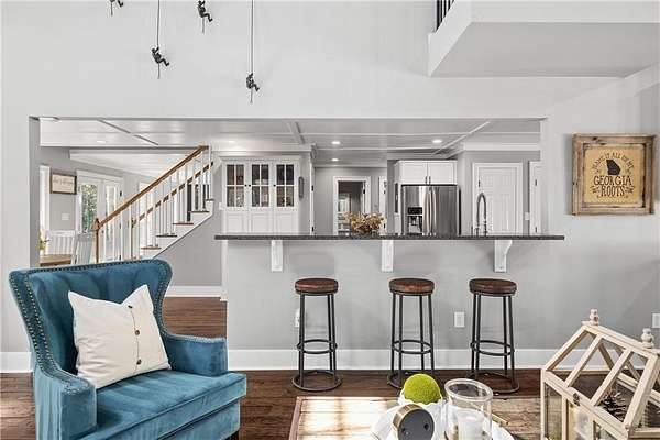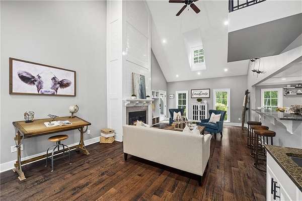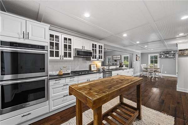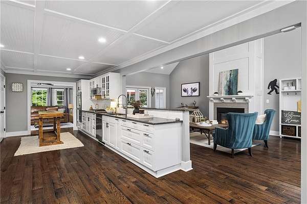 Light-filled living spaces showcase hardwood floors and upgrades throughout showcase a seamless blend of traditional character and thoughtful renovations. The chef's kitchen features stainless steel appliances, a double wall oven, farmhouse center prep island, gas cooktop, and a breakfast bar that opens to the fireside family room. A soaring cathedral ceiling, a wood-burning fireplace, French doors to the private back deck and a wet bar set the stage for gathering. A bright sunroom with French doors also opens to the rear deck for a nice cozy back room on main. Oversized main level fireside spacious dining room provides the perfect setting for formal entertaining and is an optional third living space on main level.