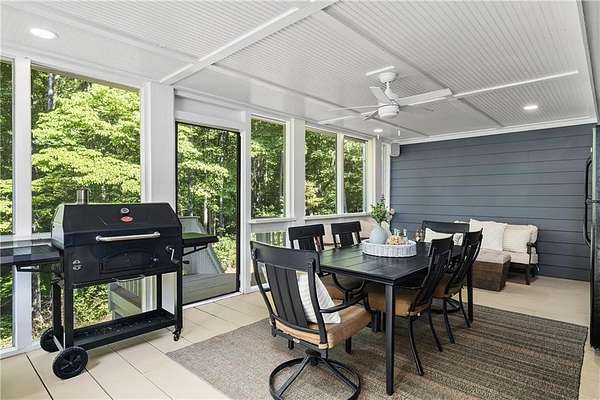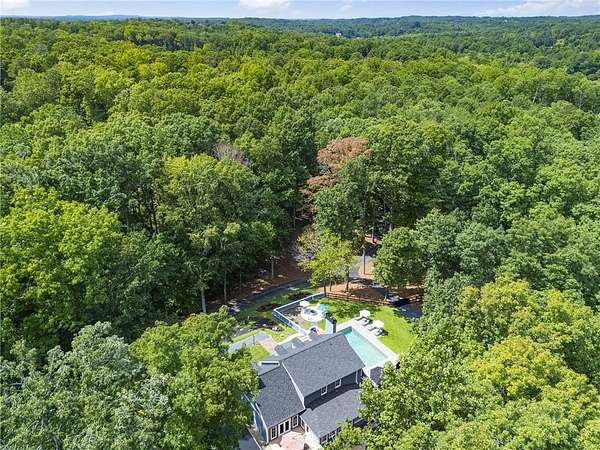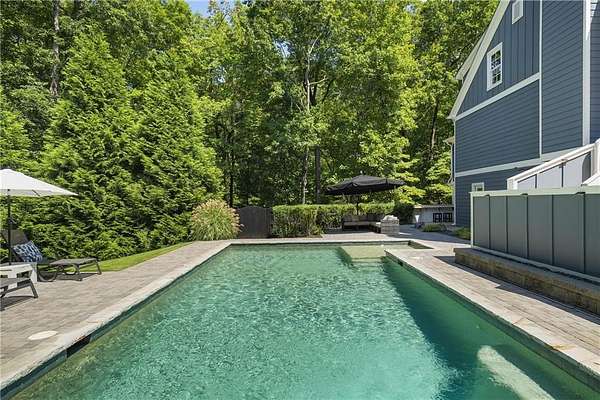 Outdoor living is equally inviting with a resort-style pool featuring a tanning ledge and a generous surrounding pool deck that easily accommodates both loungers and seating areas. Beyond the pool, a flat grassy lawn and a fire pit provide spaces for play and relaxation. A charming, screened porch off the main level offers a breezy retreat and connects directly to the backyard and pool through stairs. Creative living and dining spaces include large pool decking, upper play space/dining area and charming adjacent fire pit zone. The home is surrounded in privacy and there is a back lower creek for charm or play.