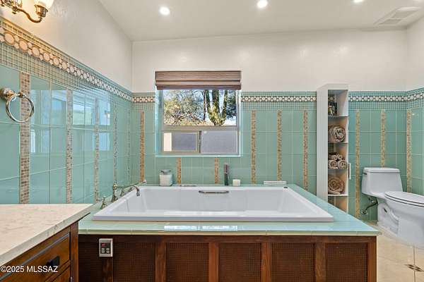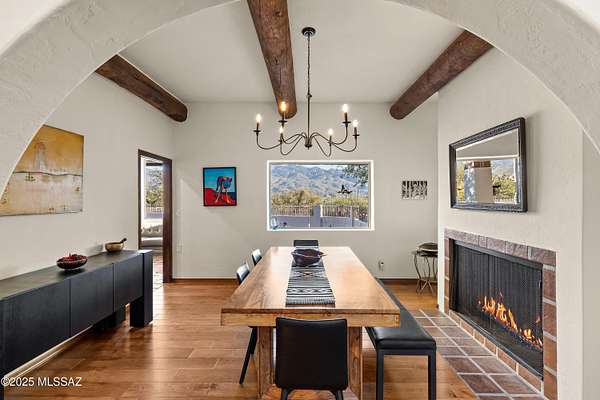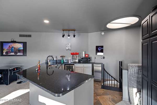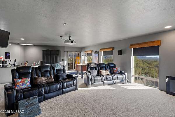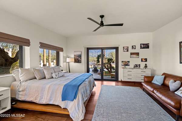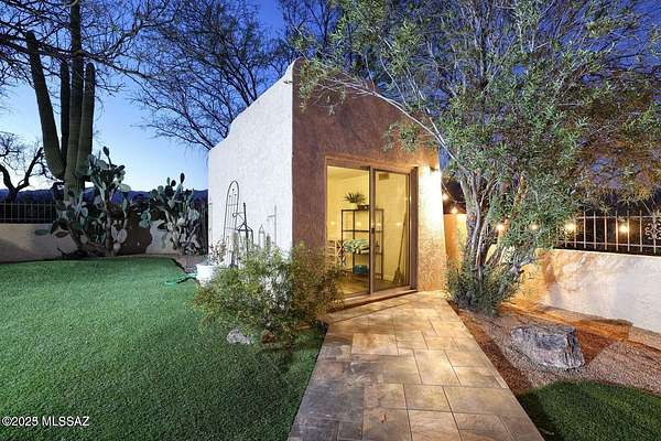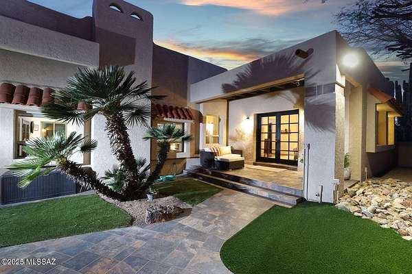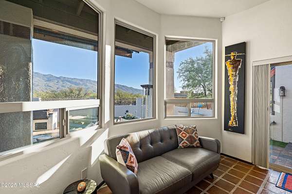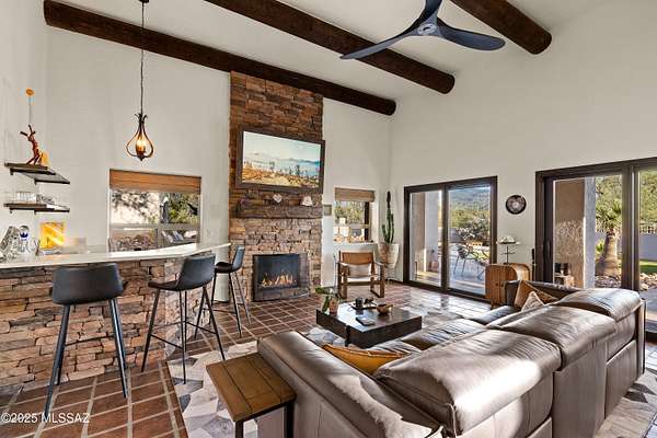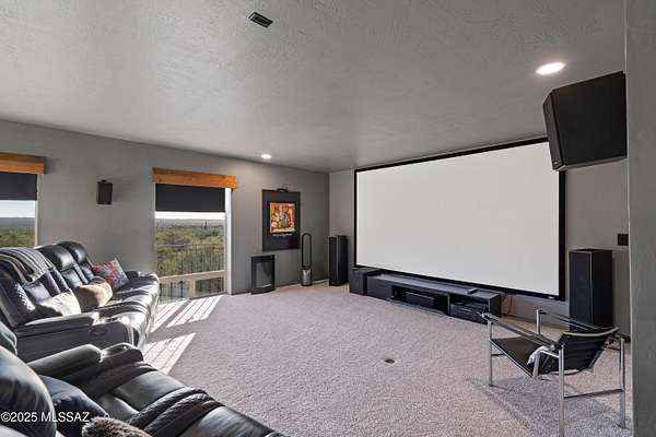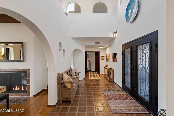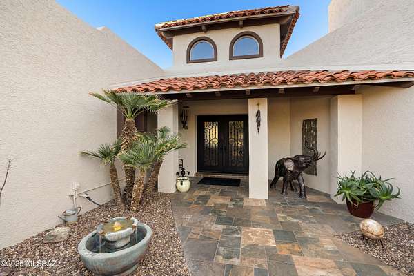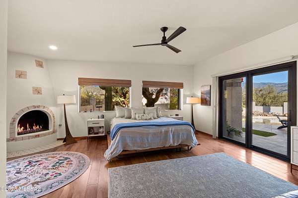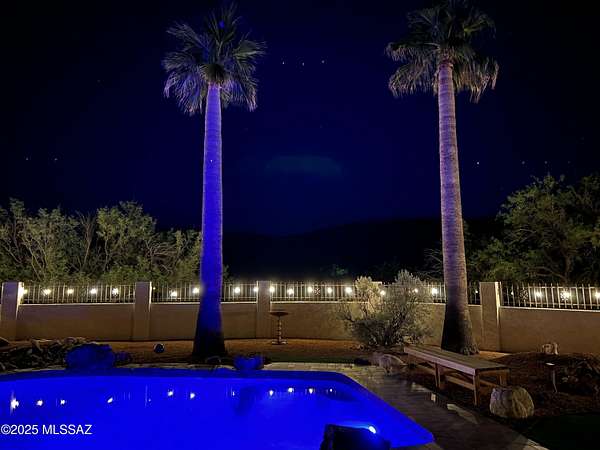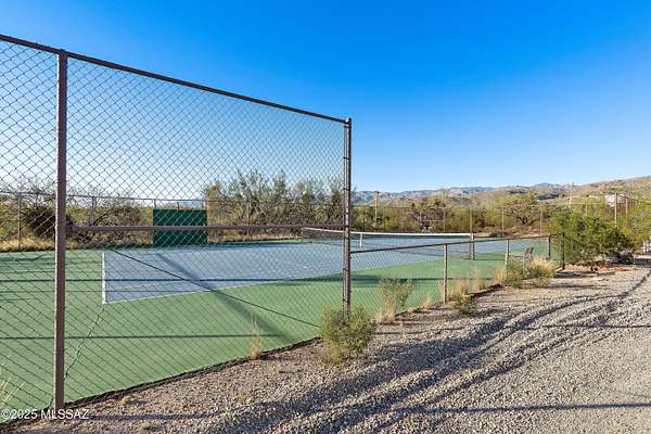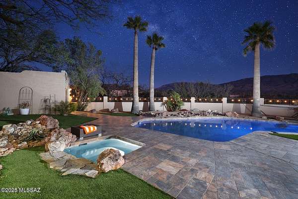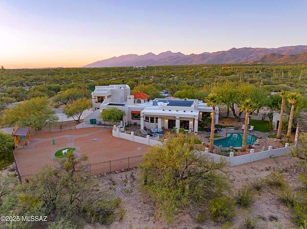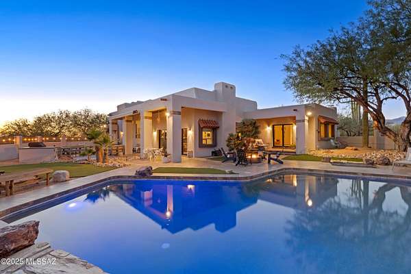 December Realtor tour of homes: WINNER OF THE MOST BEAUTIFUL HOME ON TOUR!!!...Drive through the gate and follow a winding gravel drive under old-growth mesquite trees to discover a true oasis in the desert. Set on over four acres, this stunning residence blends clean modern lines with timeless Mission Revival and old world Santa Barbara charm. Inside, warm textures and architectural detail create an inviting flow. The formal dining room and sunken living room are divided by a cozy two-sided fireplace-perfect for entertaining. The chef's kitchen features custom Neff cabinetry, luxury appliances, and quartz countertops,... ...opening to a family room with a second fireplace, wet bar, and Pella doors leading to the private backyard retreat. Five spacious bedrooms include a primary suite with a spa-style glass-tiled bath, while upstairs offers a home theater for movie nights and a private bedroom with en suite full bath! Enjoy major upgrades including three newer HVAC systems, an updated electrical panel, and countless thoughtful improvements throughout. Relax poolside with panoramic Rincon Mountain views, or rally friends for a match on your private tennis court. AND MORE...Regulation size Tennis court on property with PICKLE BALL markings too! Also a HUGE 4.4 acre lot has a "pony barn" with nice fenced arena. This could be enlarged to handle several horses or on other areas of the property additional facilities could be installed!