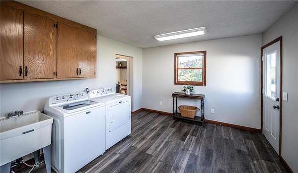 The kitchen and laundry room feature oil-rubbed bronze hardware for a cohesive, modern touch. New Maytag washer and dryer and a Whirlpool refrigerator provide reliable performance.