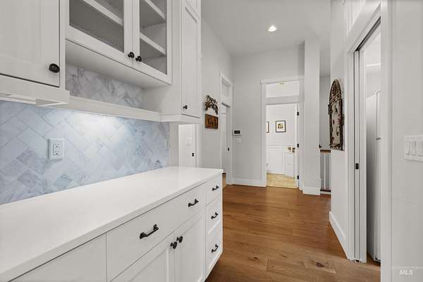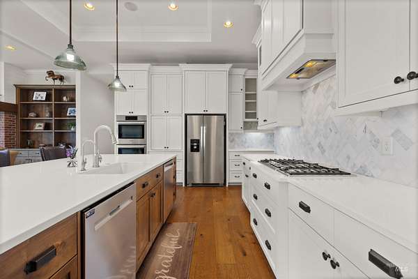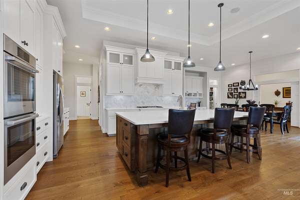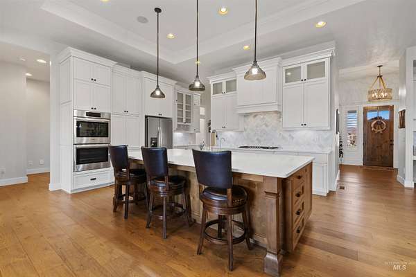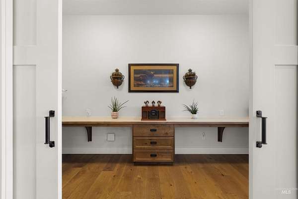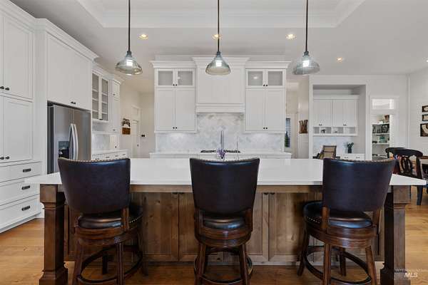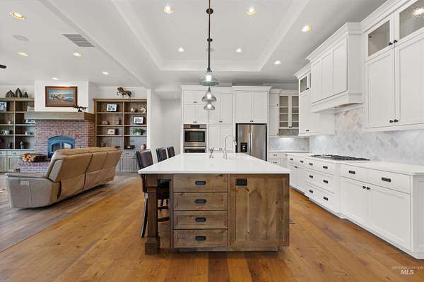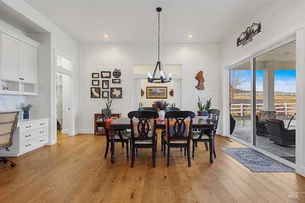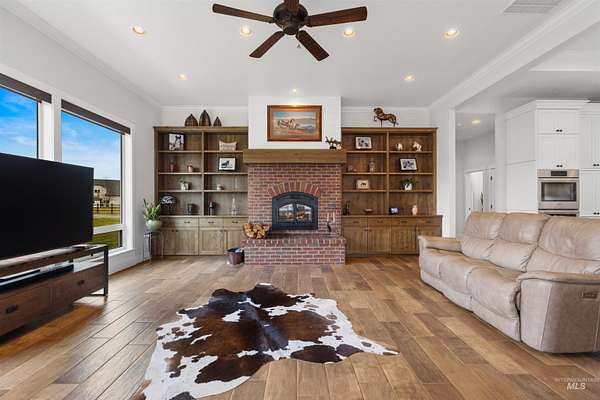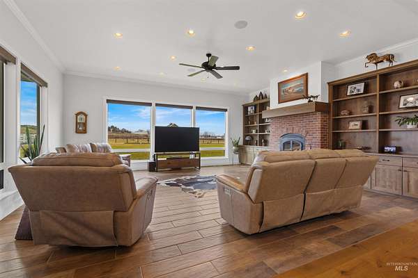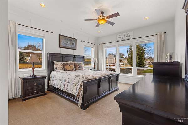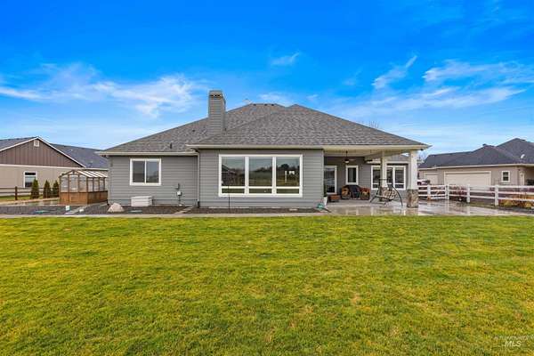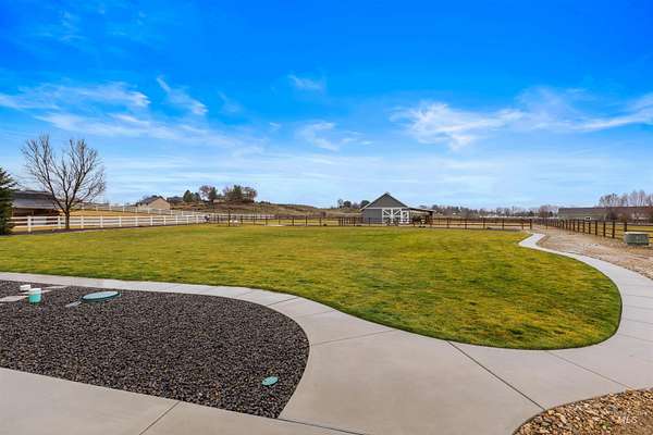 Located in a quiet Middleton subdivision, this exceptional custom-built single-level home with finished basement offers refined country living with luxury and function throughout. The open-concept design is filled with natural light from expansive family room windows capturing picturesque views. The chef's kitchen features a 6'x10' island, double ovens, dual dishwashers, abundant cabinetry, baking center, and a large pantry with refrigerator/freezer space. The main-level primary suite includes dual vanities, soaking tub, fully tiled dual-head shower, and walk-in closet. Two additional main-level bedrooms offer ensuite baths and walk-in closets. The finished basement provides a spacious great room with Sonos sound system, exercise room, bedroom, full bath, large storage room, and concrete cold storage. Outdoor living shines with a covered patio (propane BBQ stub), additional open patio, and wraparound walkway. A 30x30 barn with extended covered storage, lighting, two fenced irrigated pastures, and automatic watering trough make this property ideal for hobby farming or livestock. Additional features include a 3-car garage with built-ins, individual well, whole-house water filtration, central vacuum plumbing, wood-burning fireplace with blower, mudroom, office, and sitting room. Luxury country living designed to be experienced in person.