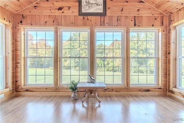 Welcome to this stunning 4-bedroom, 2.5 bath home perfectly situated on 4.5 acres of land offering both privacy and natural beauty. Enjoy a long, welcoming driveway leading to a peaceful park-like setting surrounded by mature trees and groomed trails through the woods. Inside, you'll find a spacious and inviting layout with a formal living room and dining room ideal for gatherings. The open kitchen features abundant cabinet space, newer quartz countertops, updated appliances, and a bright eat-in area that flows seamlessly into the second living room. A beautiful sunroom connects to this space, flooding it with natural light and creating a warm, welcoming atmosphere. A convenient home office and half bath complete the 1st. floor. The finished basement offers additional living and storage space, plus a roughed-in half bath for future expansion. The second living room features a cozy pellet stove, perfect for those cooler seasons. Outside, enjoy the large deck overlooking the scenic yard and trails. The property also includes an attached two-stall garage, a detached one-stall garage, and a 24X40 pole barn with electricity-ideal for hobbies, equipment, or extra storage. The roof was replaced in 2017, and numerous updates have been made throughout the home. With its blend of indoor comfort, outdoor space, and thoughtful updates, this property provides the perfect balance of tranquility and functionality - ready to welcome its next owner. Square footage does not include the finished basement. According to the owner, the square footage is 3,088 with the 12x16 sunroom and the 12x24 bonus room.