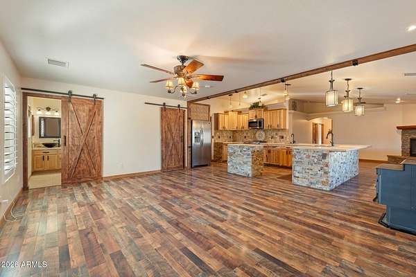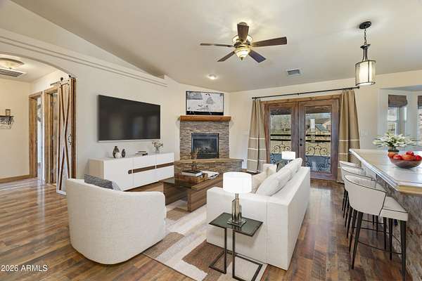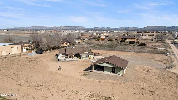 This stunning 4-bedroom, 3-bath custom ranch home sits on two fully fenced, level acres and includes a detached 1-bedroom, 1-bath guest house. Enjoy breathtaking views of the Mingus Mountain range from this exceptional property. Great for families or multi-generational living, this property offers an ideal blend of comfort and style. Before stepping inside, you'll be impressed by the immaculate front patio, featuring a beautifully crafted timber gazebo with a shingle roof and a spacious custom fire pit surrounded by built-in seating-an ideal space for relaxation and soaking in the panoramic scenery. Entering the main home, a welcoming foyer flows into an elegant dining area with a stone gas fireplace, showcasing the open-concept design and charming beam-accented ceilings.