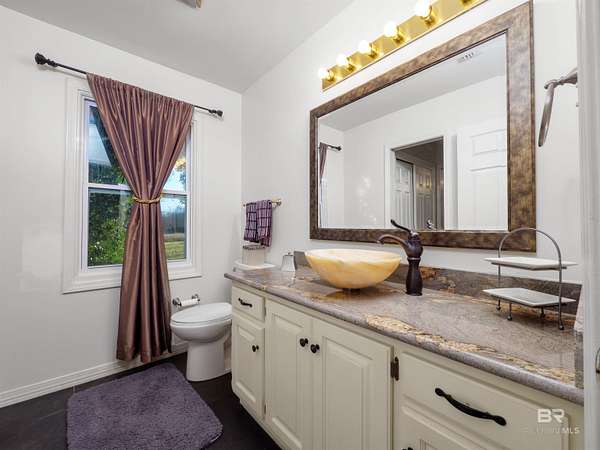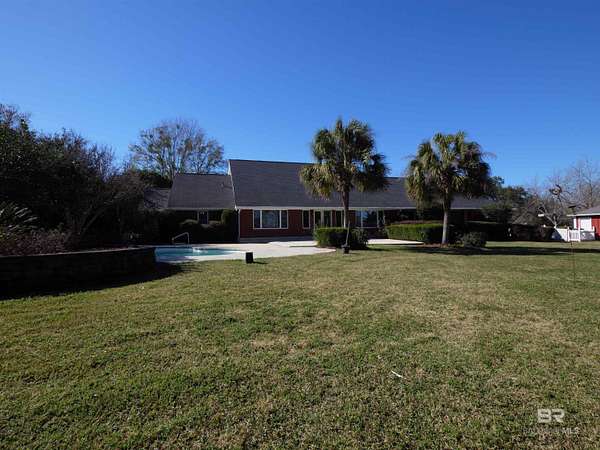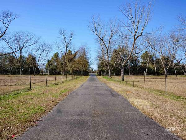 Coming soon: 1.30.2026 is a sprawling one-story estate on 17.7 acres of serene, private land with horse barn and detached garage, just 20 minutes from downtown Mobile. Built in 1992, this beautifully maintained open concept home is just over 3,900 sq ft. Ideal for entertaining the separate dining room opens to a sprawling living area with double sided gas fireplace perfectly positioned maximizing privacy and taking advantage of the peaceful views of pool, pastures and half acre lake back patio, inground gunite saltwater pool and rolling pastures. With the same views and just off the living room are the kitchen and breakfast areas with a 7 x 5 bar (with a wine and small fridge). The garage was remodeled into a 21 x 19 den with charming split brick floors and lots of built-in cabinetry. Home features include granite counters, spacious bedrooms including a huge guest suite. Anderson windows were installed in approx. 2004. The laundry room also includes the pantry area. The primary en-suite offers a jetted tub, walk-in shower, dual vanities, water closet, linen cabinet, and two walk-in closets. Two tankless water heaters, 1 gas, 1 electric, provide efficiency. The interior has been freshly repainted, and all the inside plumbing has been replaced. Both HVAC systems (inside and out) were replaced in Q4 2025. Roof replaced in 2019. Out side you'll find an exceptional barn, including a 7-stall horse barn, 1 stall currently used for feed, with huge fans, running water, 2x6 plank construction and rubber mat flooring. There are 3 pastures and 5 paddocks with cross tied fencing. More features include a chicken house, established southern trees, and a detached, finished 2 car garage with abundant attic storage. There is a large buffer area behind the property reserving long-term privacy. What a rare opportunity for country living with modern updates and convenience! Buyer to verify all information during due diligence.