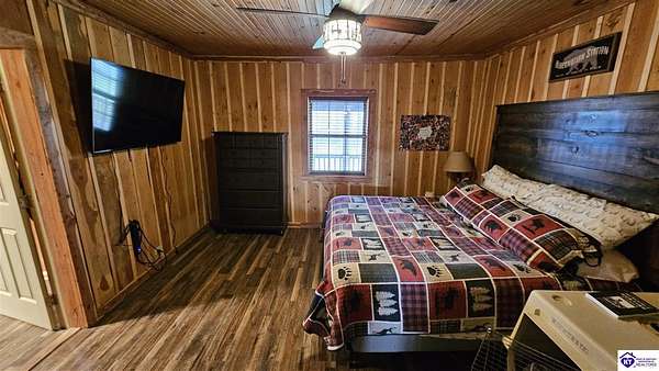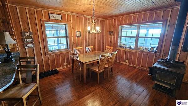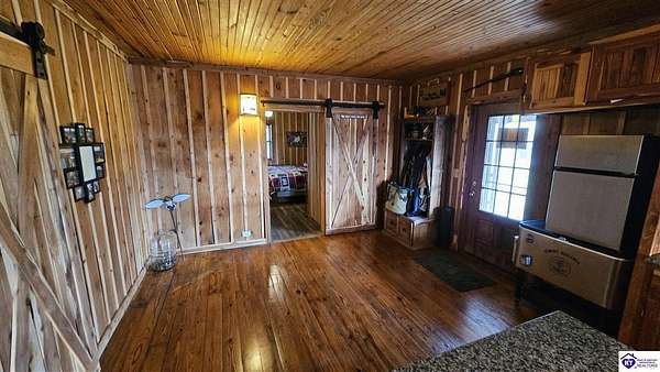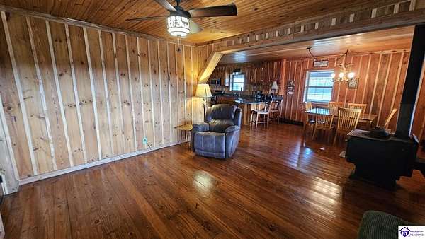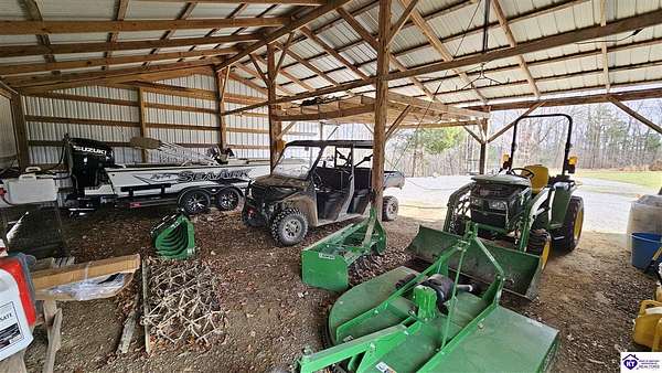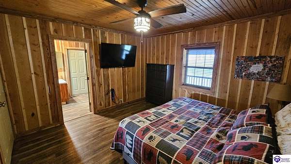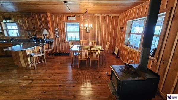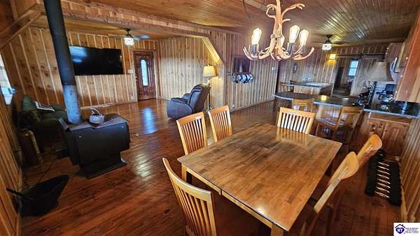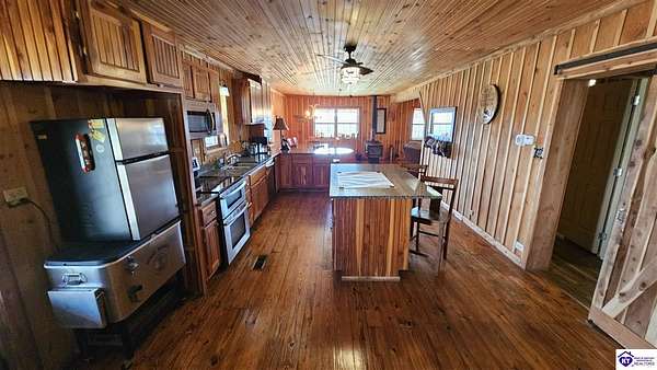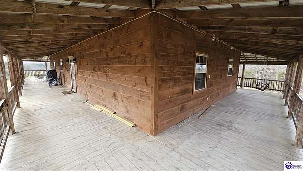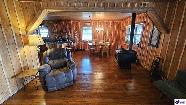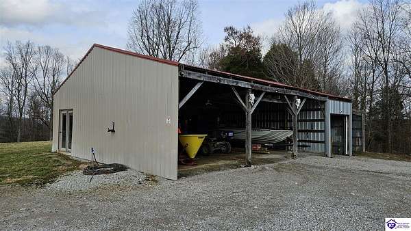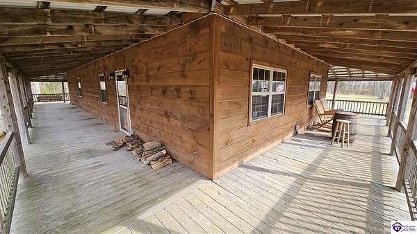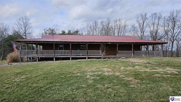 Welcome to 2586 Logsdon Cemetery Road. If you’re searching for your slice of quiet, peaceful country life look no further than this secluded 51.96 acre farm in Clarkson right by Nolin River Lake. Perched atop a ridge between the lake and the red line of Pearson Branch, this sprawling cabin and surrounding property is a haven for outdoor lovers and a hunter’s paradise for those inclined. Heading onto the property, pass the gate, you will immediately be struck by the beauty of the rolling hills and woods that await exploring. Walking up to the house, a fabulous complete wrap-around porch with swing beckons you. Heading inside brings you into an open living room, dining area, and kitchen. The beautiful hardwood floors and abundant natural light in this space continue throughout the home. A lovely wood burning stove is situated between the living room and dining area. The gorgeous kitchen offers ample cabinet space with breakfast bar, granite countertops, stainless steel appliances, and island with a 2nd breakfast bar. Separate sliding barn door entrances lead to the primary suite and the other two bedrooms and full bath. The primary suite offers a spacious bedroom with two large closets and a private bath with walk-in shower and the laundry closet. The other bedrooms are also generously sized and have large closets as well. Heading out back leads you into a huge yard providing plenty of space for kids or pets to play in before even getting out into the rest of the land. The enormous 33’ x 57’ carport and garage provides all the room you could ever need to hold all your vehicles, lawn equipment, ATVs, or boats via its’ five bays. The 12’ x 16’ storage shed has electric service and additional loft area. Don’t miss out on this unique opportunity and schedule a showing today!
