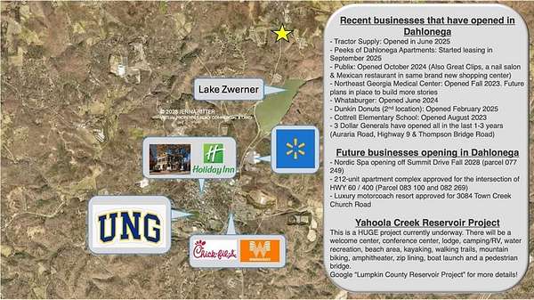 Welcome to Dahlonega - the picturesque, Hallmark-style town that just keeps growing! With the University of North Georgia (part of the fastest-growing university system in Georgia), a flourishing wine industry (dubbed the Napa Valley of the South), a booming destination wedding market, deep gold rush nostalgia, and abundant outdoor recreation, people are pouring in, spending big and even putting down roots. And with that growth comes demand. Dahlonega needs more goods, services, and experiences to support both the local community and a constant influx of tourists. This property is perfectly positioned to fill those gaps and bring your vision to life | PRIME LOCATION & SITE FEATURES | 350 feet of frontage on US Hwy 19/60 (high traffic visibility) - minutes from Historic Dahlonega Square - surrounded by high-density housing - right down the road from the county's est. $70MM Lake Zwerner/Yahoola Creek Reservoir Master Plan (set to include: amphitheater, zip-lining, hiking & biking trails, beach area, RV camping) | PROPERTY DETAILS | 7.11 acres of gently rolling terrain (ideal for development or expansion) - main building: 2,830 sq ft with a wide open "meeting hall" layout - outside access basement with potential for a manager's apartment, storage, or rental space (building is structurally sound, needs some TLC) - storage building: 40 ft x 19 ft with partial enclosure & 12'W x 9'H roll-up door | ZONING & DEVELOPMENT POTENTIAL | character area - Community Village Center (flexible uses including commercial, retail, and residential) - County parcel with option to annex into the City for access to City water & sewer - surrounded by City-zoned commercial (makes future development more adaptable) - additional acreage available to the south for larger-scale visions.