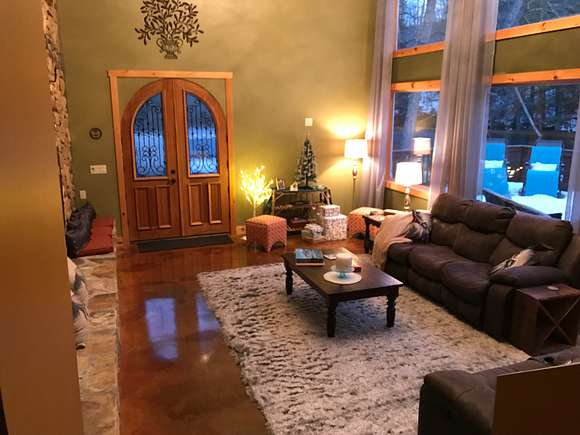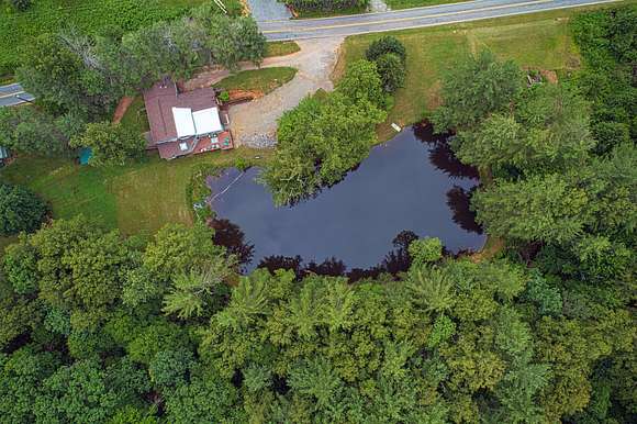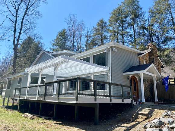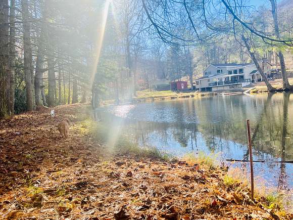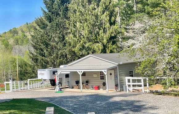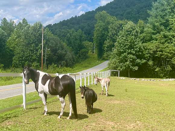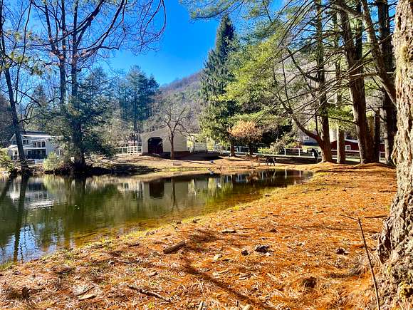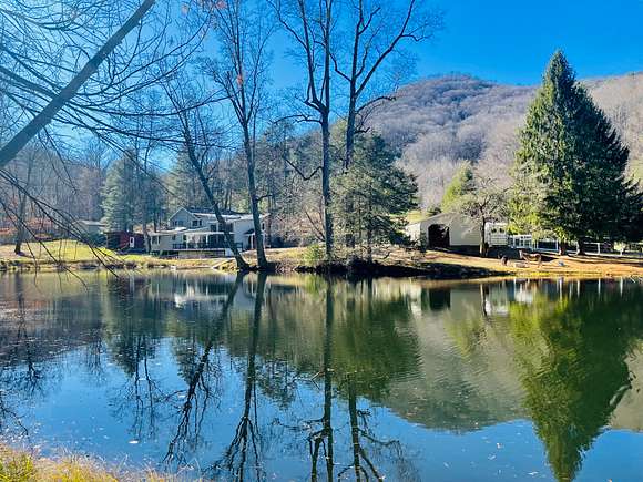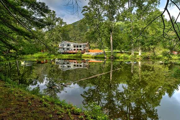 Rustic Luxury, completely custom, one-of-a-kind Main House with pond, rapid creek, waterfall and riding trails offers country life just 21 minutes to downtown Asheville center. Mountains all around, majestic timber surrounds the stocked pond with new boat dock and flowing creeks that have wading and panning areas, 2 barns, horse trailer pad, radiant & plenty of green space with the added outbuildings.