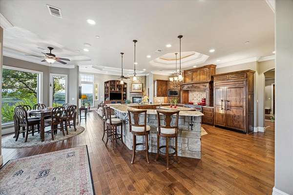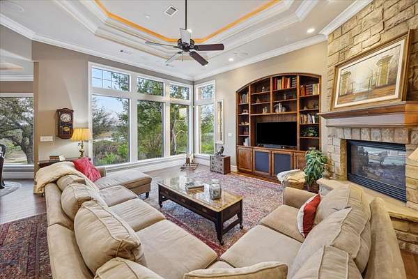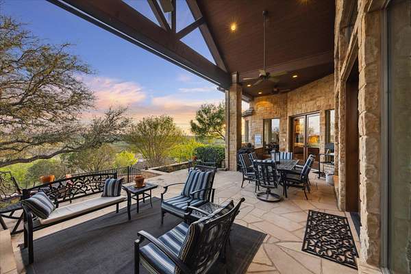 Welcome to the Overlook at Chimney Cove Estates, a beautiful, luxurious Lake Travis estate perched high on a 7.5-acre gated property with amazing views of the Lake and Hill Country. The thoughtfully custom designed one-level home is 4,949 sf with additional garage space with HVAC and bath that could easily be converted to a casita. There are 3 bedrooms, 4.5 baths and a dedicated office with a hidden work area. The home has been designed with functionality and capturing the beauty of the surroundings. Constructed primarily with stone, the property features sprinkler system, a new metal roof (July 2024) optimized for rainwater collection with two 18,900-gallon storage tanks, foam insulation throughout for energy efficiency, and lightning rods for enhanced safety. The gourmet kitchen with top-tier appliances is perfect for family and friends to gather or enjoy a cozy night at home. All lower cabinets in kitchen, butler's pantry and laundry room have pull out shelves for convenience. The outdoor covered porch provide a seamless transition from the house to the grill, wood burning fireplace, hot tub and gorgeous views. There are 5 attached garage spaces with additional garage space in a 44' x 40' barn. The barn has drive-thru capability and ample storage. There is a 220volt, 50-amp breaker installed for electric car charging and RV hook-up. The lakeside amenities include approximately, 300' shoreline, a private dock with Hydro lift, wave runner lift, and durable Trex decking. Ag exempt and horses allowed!