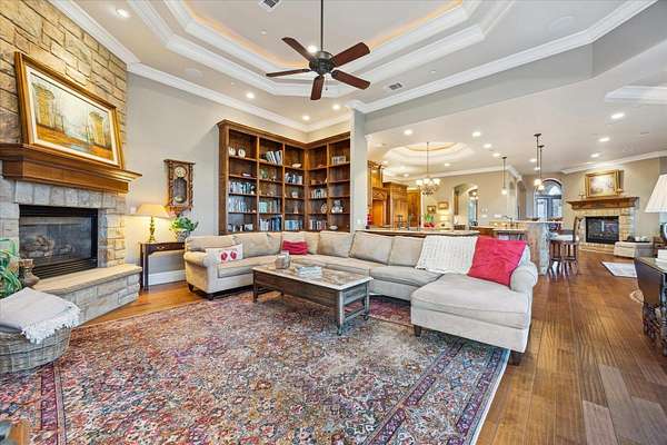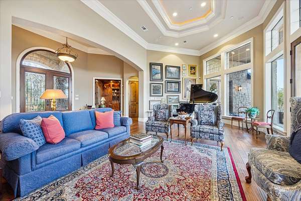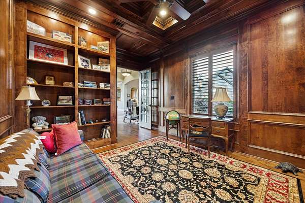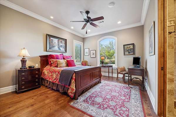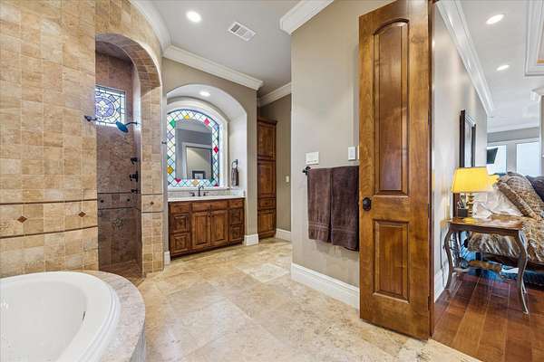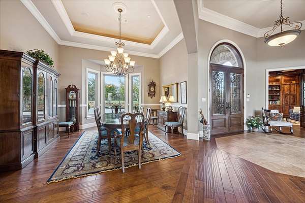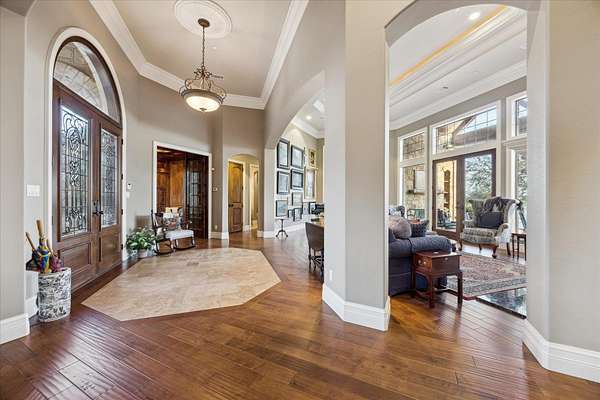 - Breakfast Bar, Coffered Ceiling(s), Counters-Solid SRFC, Crown Molding, Granite Counters, High Ceilings, Pantry, Recessed Lighting, Split Bedroom, Stained Glass Windows, Walk-In Closet(s), Wet Bar