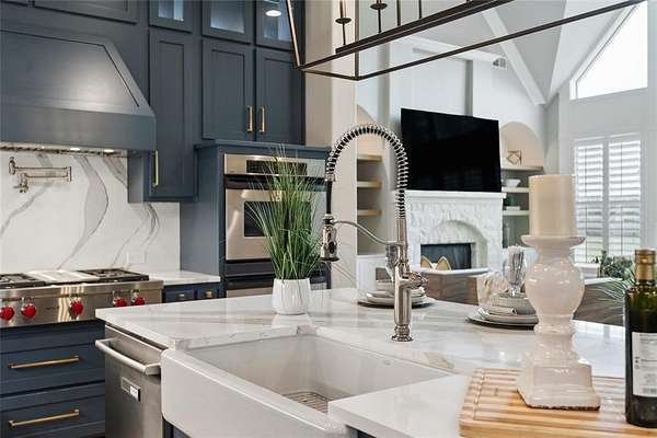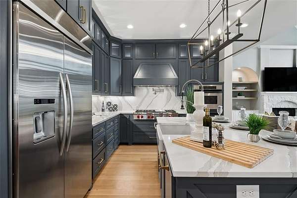 At the heart of the home, the chef’s kitchen is beautifully appointed with professional-grade appliances, an oversized island, walk-in pantry, and generous prep and serving areas. The layout flows seamlessly to indoor dining, ideal for hosting on any scale.