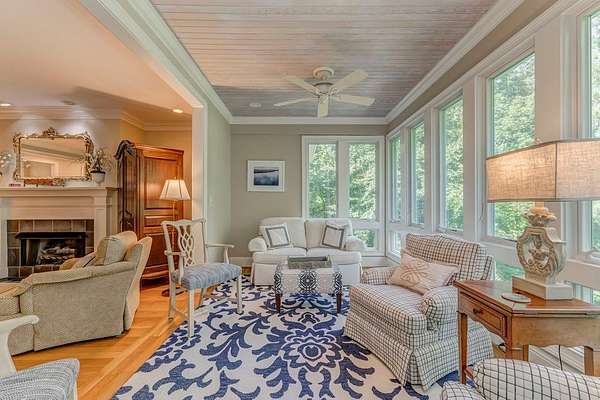 Elegant Executive Brick Home - Perfect for Entertaining. Step into luxury with this stunning home designed for both comfort and entertaining. The chef's kitchen is a true centerpiece, featuring a high-end built-in gas range, paneled refrigerator, custom cabinetry, and a cozy sitting area--ideal for engaging with guests while you cook. The spacious living room with a fireplace flows seamlessly into a bright sunroom, creating a warm and inviting atmosphere. The expansive primary suite is a private retreat, offering dual walk-in closets, a relaxing tub, and a beautifully tiled shower. Throughout the home, you'll find elegant touches like plantation blinds and crown molding that add timeless charm. Too many custom features to mention. Minutes to The Farm Golf Course.