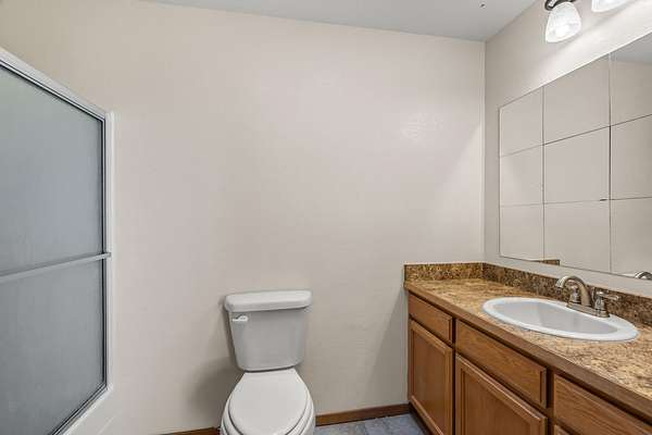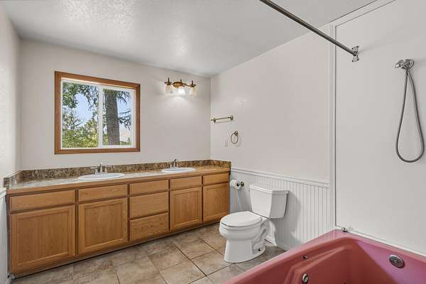 - Breakfast Bar, Ceiling Fan(s), Double Vanity, Laminate Counters, Linen Closet, Shower/Tub Combo, Soaking Tub