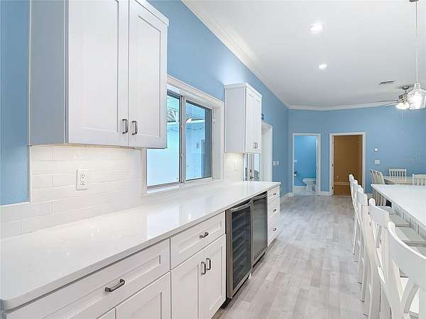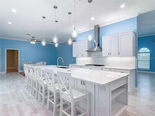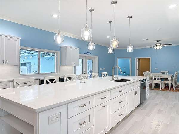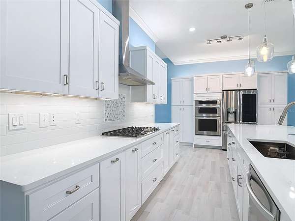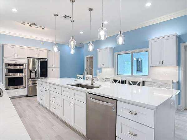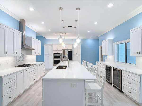 Step inside to a completely renovated kitchen (2023) featuring top-tier LG appliances, a 13' quartz island with seating for 6-8, a five-burner gas cooktop, double wall oven, beverage center, wine fridge, and custom lighting. The main living areas boast waterproof luxury vinyl plank flooring (2023), while the updated master bath (2024) showcases new vanities, quartz counters, and smart mirrors.