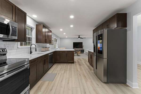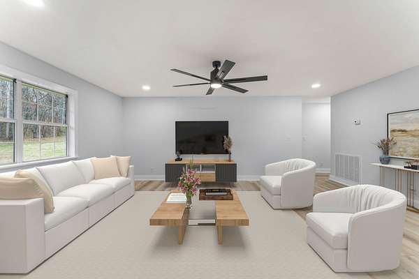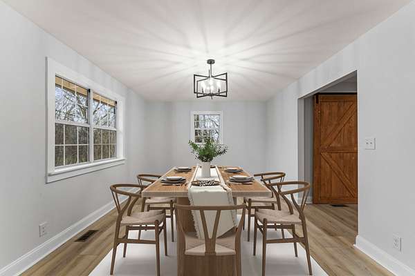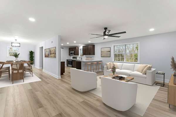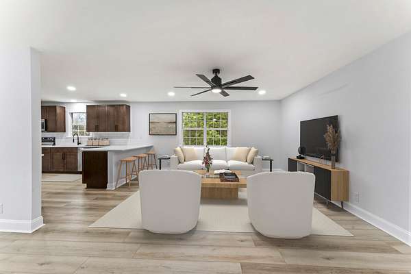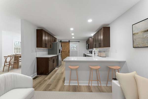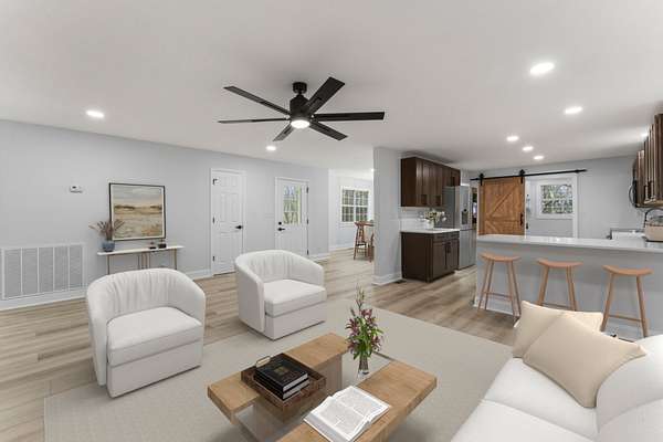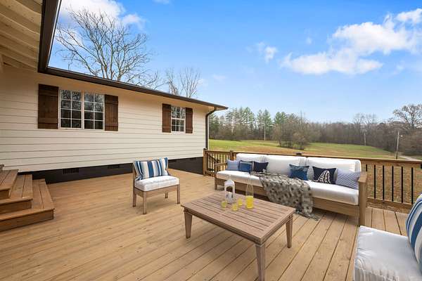 Welcome home to 2591 Harlan Farms Rd, a beautifully reimagined 4-bed, 2-bath, modern farmhouse feel nestled on nearly 3 private acres in Columbia. Every inch of this home has been thoughtfully renovated with high-end finishes, timeless design choices, and the peaceful charm of country living. Step inside to an inviting open-concept floor plan featuring brand-new LVP flooring throughout and a fully remodeled chef's kitchen with custom Shenandoah cabinetry (Truffle finish), quartz countertops, tile backsplash, large peninsula, and all-new stainless appliances. The airy layout flows seamlessly into spacious living and dining areas, offering plenty of room for hosting, family gatherings, and everyday living. The primary suite is a true retreat, showcasing a fully renovated spa-style bathroom with new tile flooring, new vanity, new toilet, tile shower walls, and a frameless glass shower. The master closet also features new tile flooring for a luxurious touch. The generously sized mudroom/laundry room has also been fully renovated to maximize functionality and storage. The home offers a second beautifully renovated full bathroom, new lighting and plumbing fixtures throughout, new interior paint, upgraded doors and trim, a serviced HVAC system and a new water heater--giving you peace of mind for years to come. Outside, you'll find fresh exterior paint, new 6" rain gutters, new security lighting, a covered front porch, and not just one but two incredible outdoor living spaces--a brand-new 400 sqft front deck and a refreshed and repainted rear deck, perfect for enjoying quiet mornings or hosting friends in the evenings. If you're searching for a beautifully renovated home with acreage, privacy, and modern comfort, this one has it all. Move-in ready, thoughtfully designed, and built to last--homes like this don't come around often.