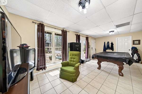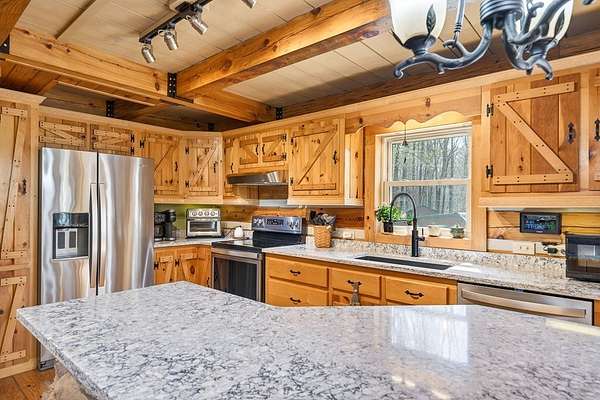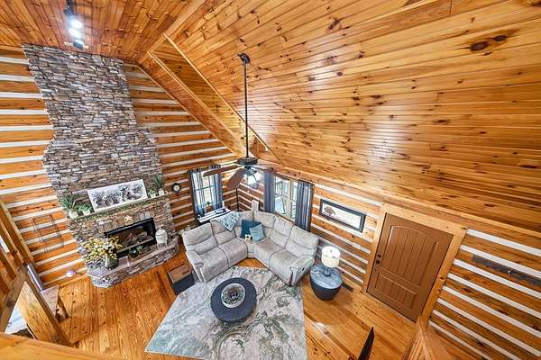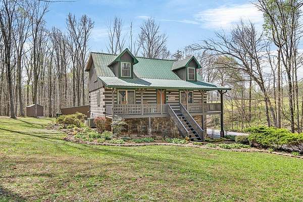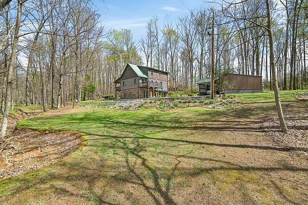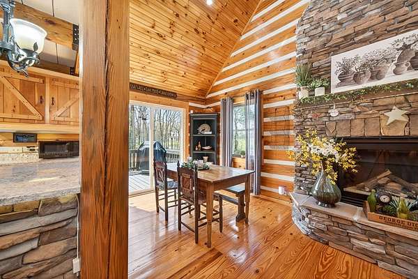 Tucked away on over 4 beautifully manicured acres,this charming log cabin-style home offers the perfect blend of privacy,comfort & everyday convenience. Surrounded by a peaceful canopy of mature trees the property feels like your own personal retreat-ideal for lazy afternoons in a hammock, building a treehouse or simply enjoying the quiet beauty of nature. The inviting covered front porch sets the tone for a relaxed lifestyle whether you're sipping morning coffee as the sun rises or unwinding in the evening. Inside the home welcomes you w/soaring ceilings & a stunning grand stone gas fireplace. The newly remodeled kitchen features top-notch finishes perfect for both daily living & entertaining. The deck just off the dinning rm provides the ideal space for grilling & entertaining. The walkout basement w/full bath, bdrm & spacious gathering area is perfect for multi-generational living or even potential rental income.This property is more than just a home-it's a total lifestyle!