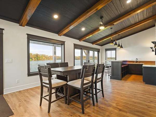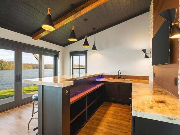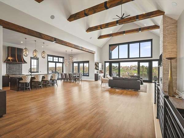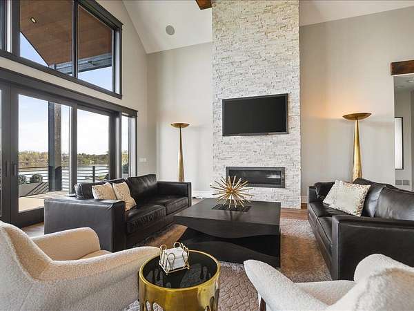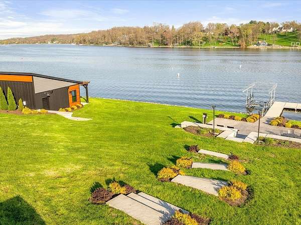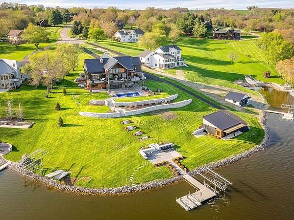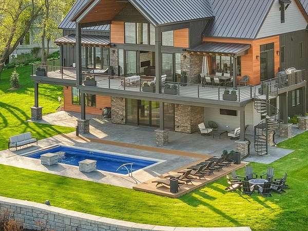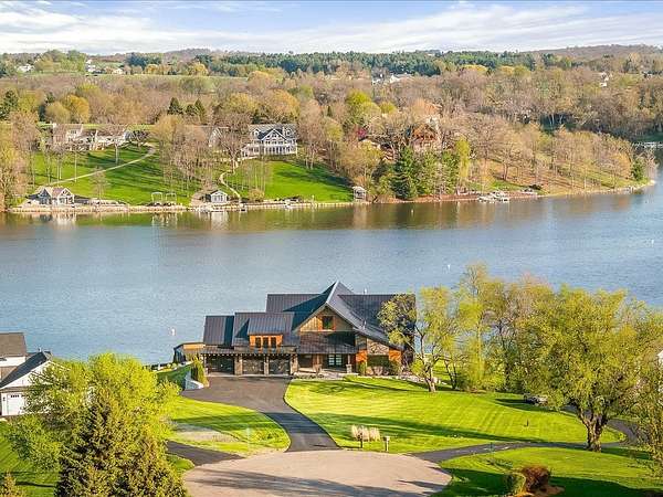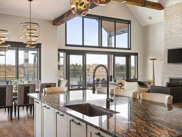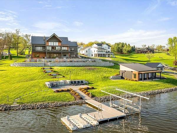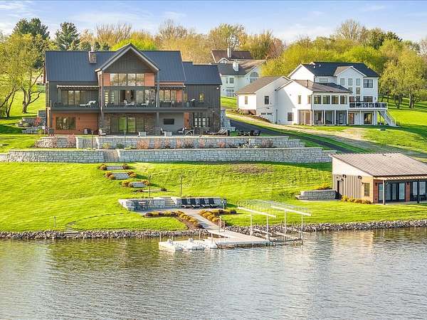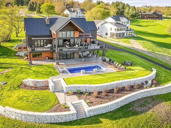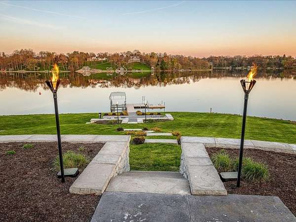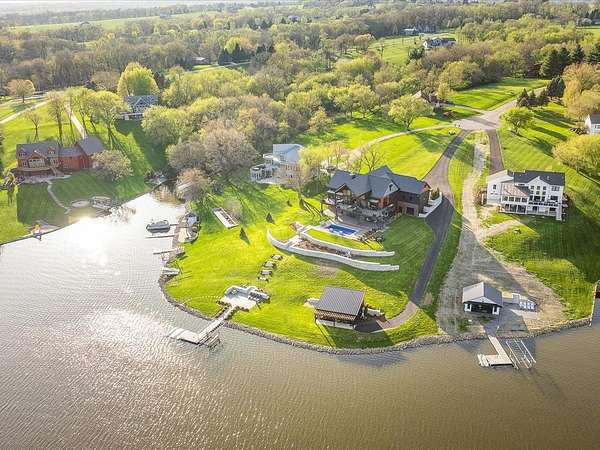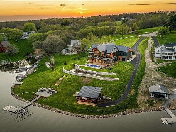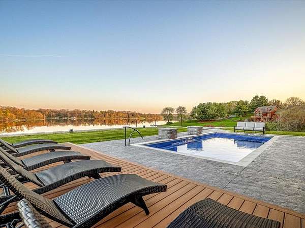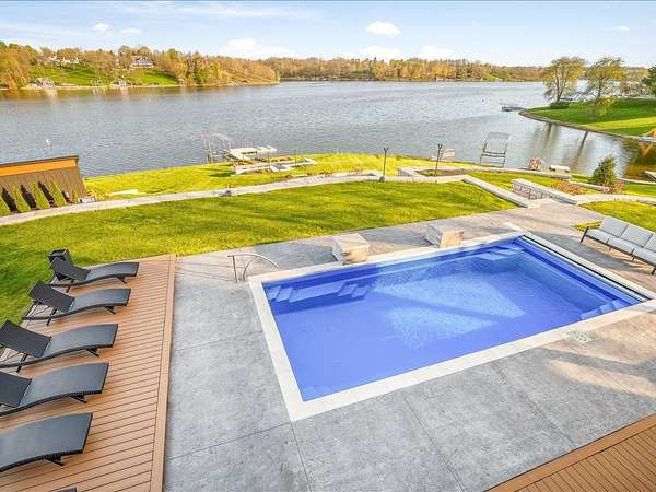 Stunning 5,949 sq ft custom-built luxury waterfront home (238' shoreline) featuring 4 bedrooms, 3 full baths, and 2 half baths with exceptional craftsmanship throughout. Main level offers 27ft vaulted ceilings with commissioned quarter sawn white oak beams, engineered hardwood floors, two en-suite bedrooms, a designer kitchen with JennAir and Fisher Paykel appliances, custom cabinetry, black granite, Cambria quartz surfaces, and a pantry. Primary suite includes a private fireplace, spa-like bath, custom walk-in closet, and direct deck access. Lower level is built for entertaining with heated porcelain floors, a double-sided fireplace, full bar with high-end appliances, wine cellar with climate control, and a custom bunk room with built-in alder wood bunks. Two laundry rooms, upgraded millwork, custom lighting, custom railings and Sonos system throughout. Heated upper and lower garages with epoxy floors and finished interiors. Exterior showcases LP SmartSide siding, stone and metal accents, and extensive professional landscaping. Outdoor living is unmatched with a large maintenance-free deck featuring a built-in grill, spiral staircase, under-deck drainage, and outdoor TV. Enjoy the in-ground pool with stamped concrete, fountains, firepit, gas torch-lit walkways, and a fully equipped beach house with bar, 1/2 bath, and shoreline patio.