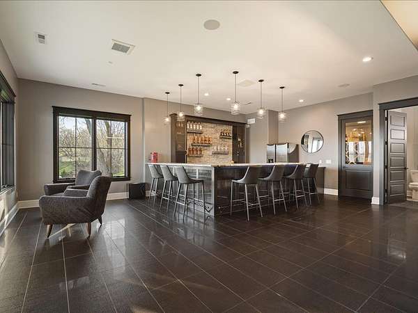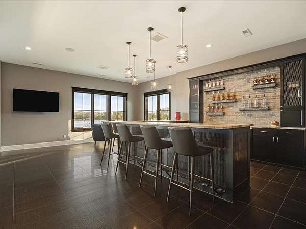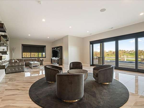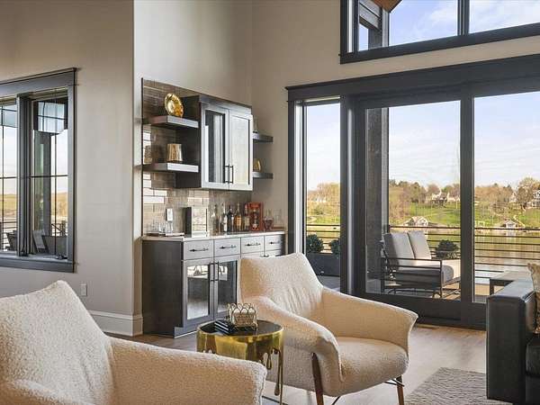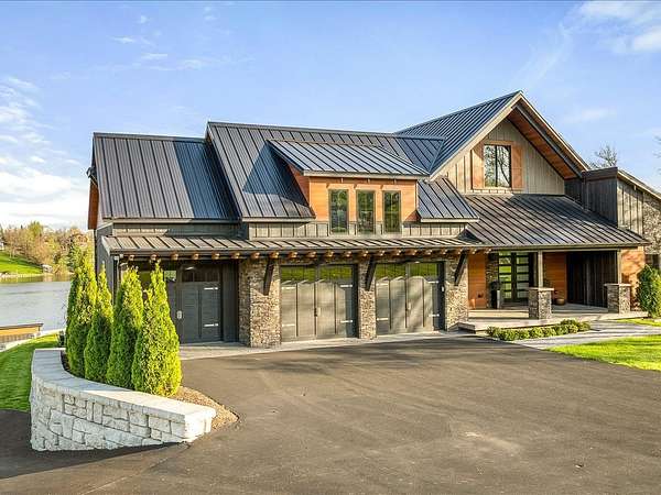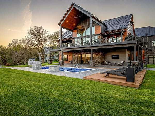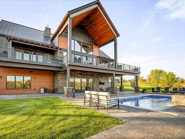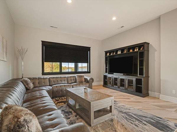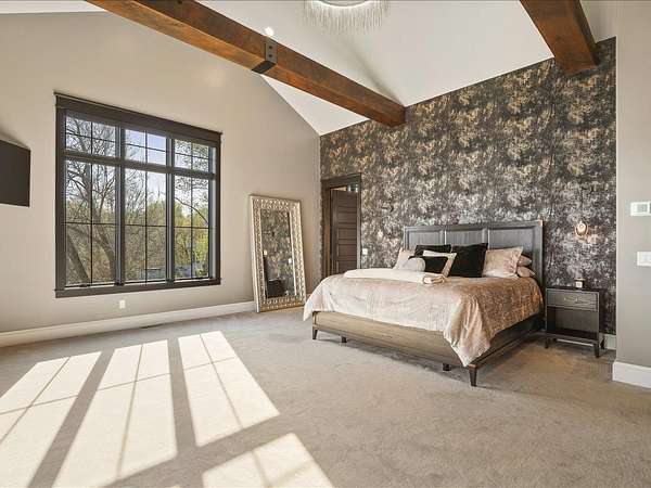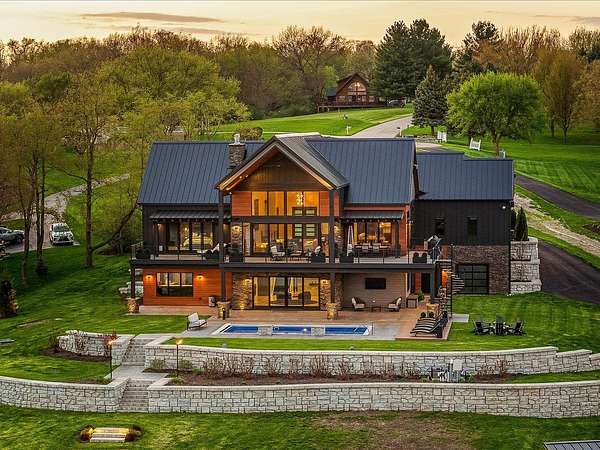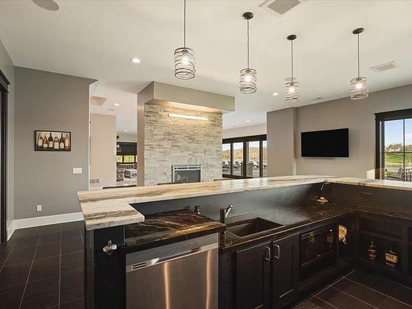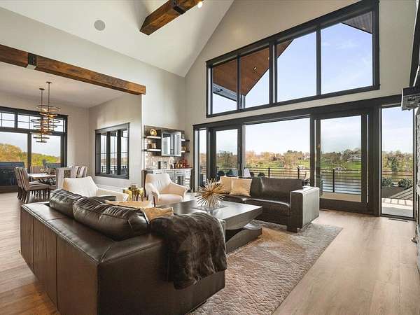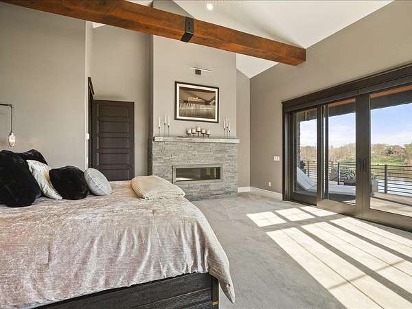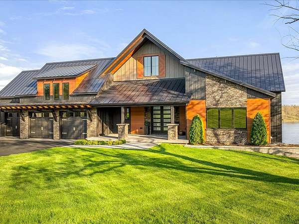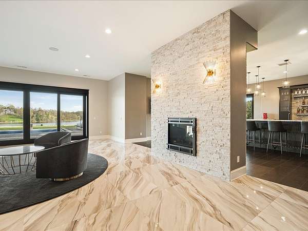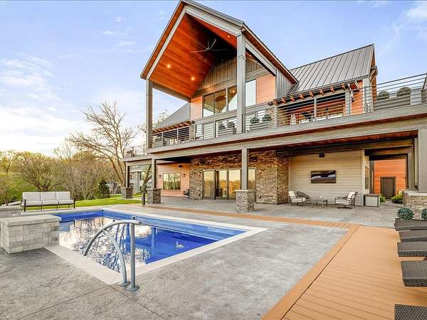 Stunning 5,949 sq ft custom-built luxury waterfront home (238' shoreline) featuring 4 bedrooms, 3 full baths, and 2 half baths with exceptional craftsmanship throughout. Main level offers 27ft vaulted ceilings with commissioned quarter sawn white oak beams, engineered hardwood floors, two en-suite bedrooms, a designer kitchen with JennAir and Fisher Paykel appliances, custom cabinetry, black granite, Cambria quartz surfaces, and a pantry. Primary suite includes a private fireplace, spa-like bath, custom walk-in closet, and direct deck access. Lower level is built for entertaining with heated porcelain floors, a double-sided fireplace, full bar with high-end appliances, wine cellar with climate control, and a custom bunk room with built-in alder wood bunks. Two laundry rooms, upgraded millwork, custom lighting, custom railings and Sonos system throughout. Heated upper and lower garages with epoxy floors and finished interiors. Exterior showcases LP SmartSide siding, stone and metal accents, and extensive professional landscaping. Outdoor living is unmatched with a large maintenance-free deck featuring a built-in grill, spiral staircase, under-deck drainage, and outdoor TV. Enjoy the in-ground pool with stamped concrete, fountains, firepit, gas torch-lit walkways, and a fully equipped beach house with bar, 1/2 bath, and shoreline patio.