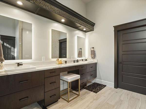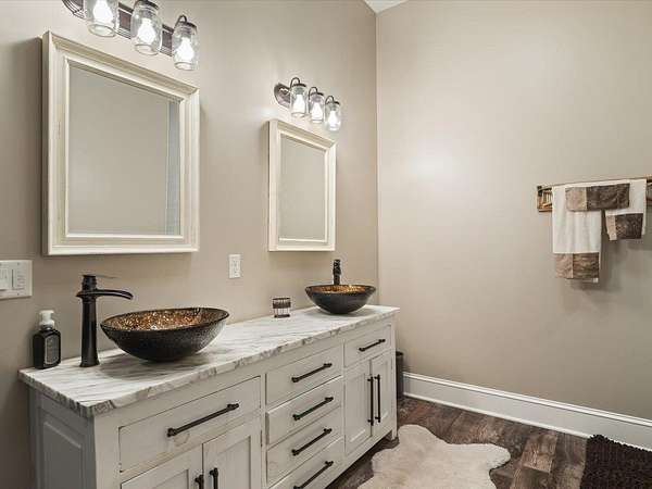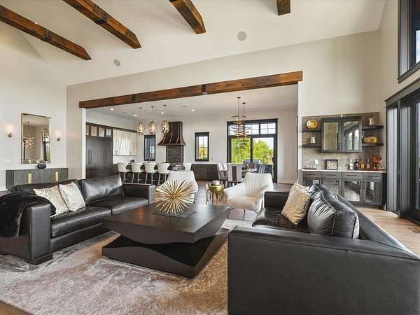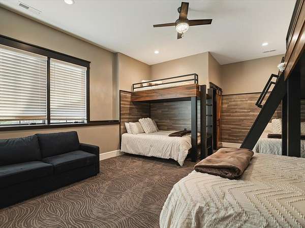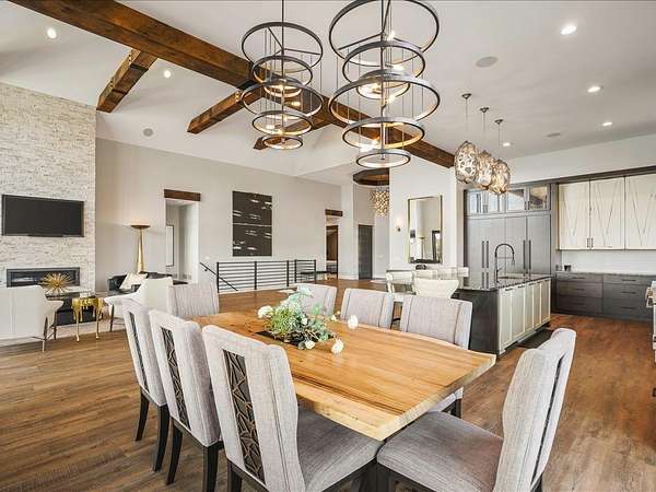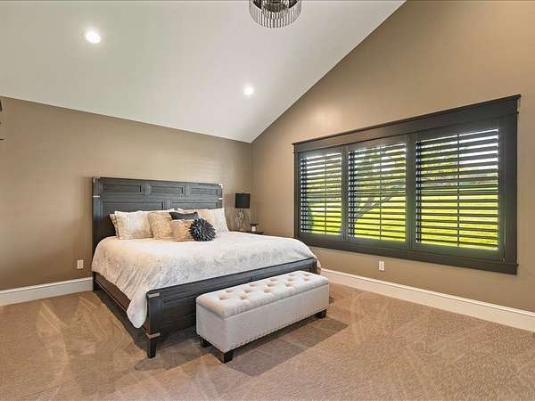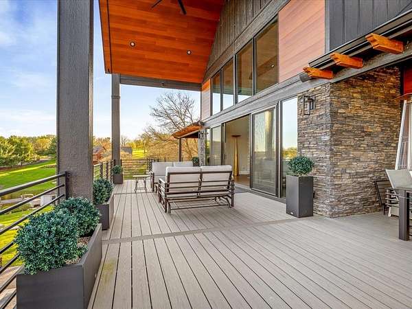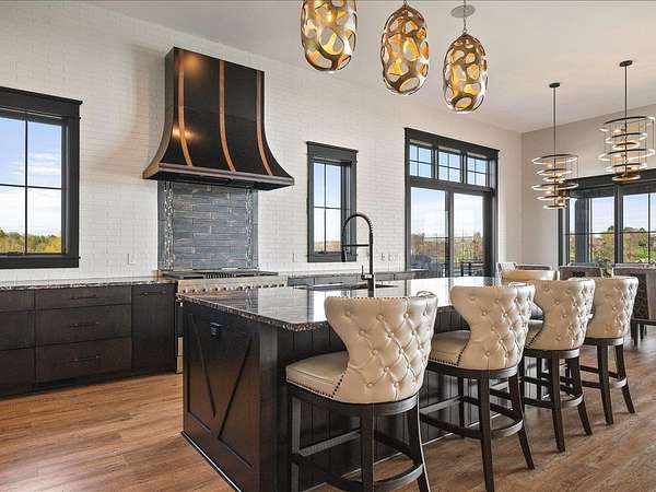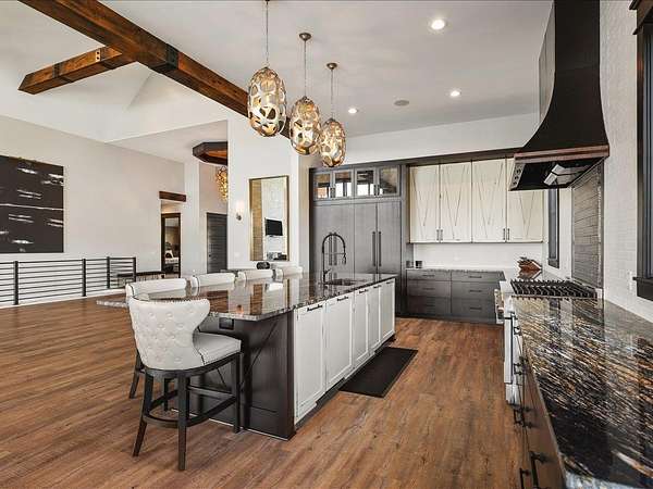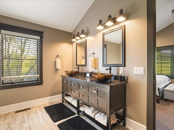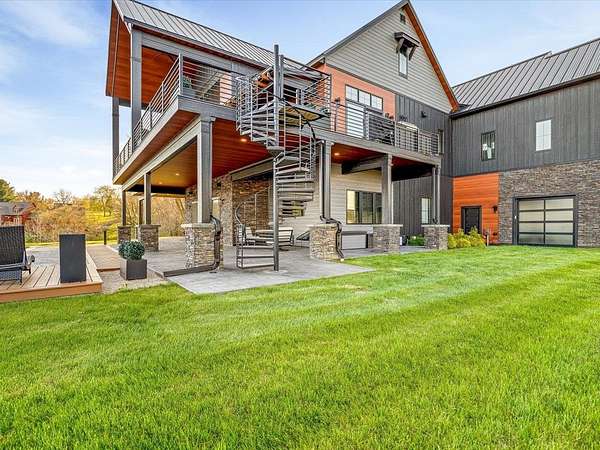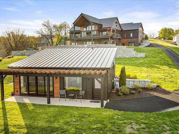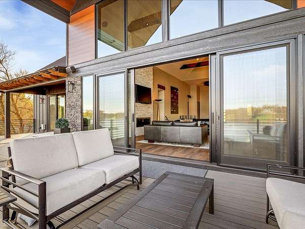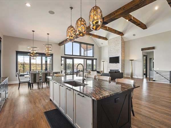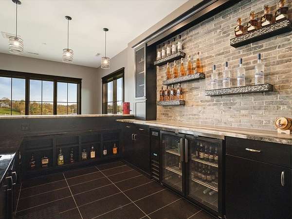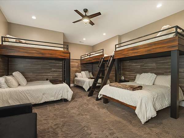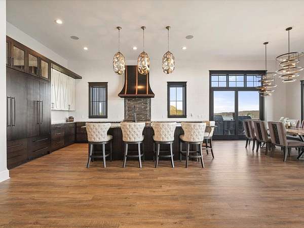 Stunning 5,949 sq ft custom-built luxury waterfront home (238' shoreline) featuring 4 bedrooms, 3 full baths, and 2 half baths with exceptional craftsmanship throughout. Main level offers 27ft vaulted ceilings with commissioned quarter sawn white oak beams, engineered hardwood floors, two en-suite bedrooms, a designer kitchen with JennAir and Fisher Paykel appliances, custom cabinetry, black granite, Cambria quartz surfaces, and a pantry. Primary suite includes a private fireplace, spa-like bath, custom walk-in closet, and direct deck access. Lower level is built for entertaining with heated porcelain floors, a double-sided fireplace, full bar with high-end appliances, wine cellar with climate control, and a custom bunk room with built-in alder wood bunks. Two laundry rooms, upgraded millwork, custom lighting, custom railings and Sonos system throughout. Heated upper and lower garages with epoxy floors and finished interiors. Exterior showcases LP SmartSide siding, stone and metal accents, and extensive professional landscaping. Outdoor living is unmatched with a large maintenance-free deck featuring a built-in grill, spiral staircase, under-deck drainage, and outdoor TV. Enjoy the in-ground pool with stamped concrete, fountains, firepit, gas torch-lit walkways, and a fully equipped beach house with bar, 1/2 bath, and shoreline patio.