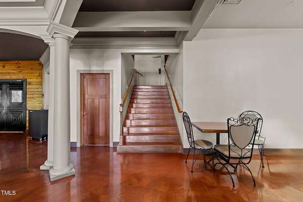 - Bar, Beamed Ceilings, Built-In Features, Butler's Pantry, Cathedral Ceiling(s), Ceiling Fan(s), Chandelier, Crown Molding, Dining L, Dressing Room, Eat-In Kitchen, High Ceilings, Kitchen/Dining Room Combination, Pantry, Recessed Lighting, Smooth Ceilings, Sound System, Wet Bar, Wired For Sound