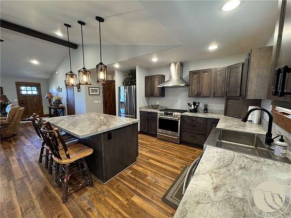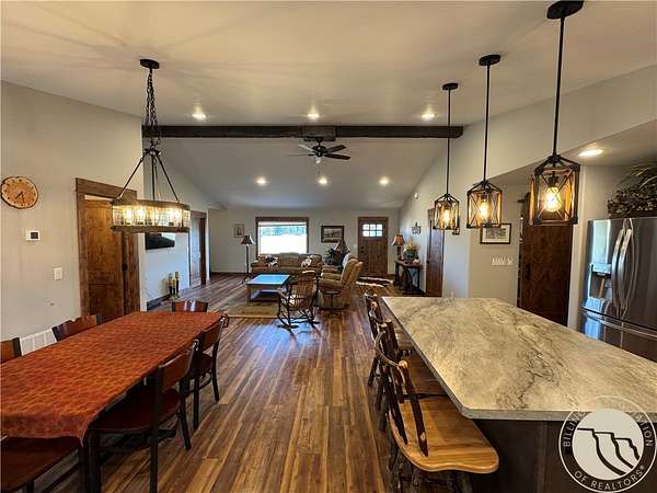 Stunning 2022 single-level home with Yellowstone River access and sweeping views of the mountain ranges. Set on just over 2 acres in the Mallard Springs subdivision, open space, and classic Montana scenery in every direction. The 3 bedroom, 2.5-bath home features an open-concept design with vaulted ceilings, custom wood trim, and quality finishes throughout. The kitchen offers a large island, stainless steel appliances, farmhouse sink, custom cabinetry, and modern lighting-ideal for everyday living or entertaining. The primary suite includes a walk-in tiled shower, double vanities, and ample storage, while additional bedrooms provide flexible guest or office space. Outside, enjoy manicured lawn, views, and a large finished garage for vehicles and outdoor gear. Peaceful rural setting just minutes from Big Timber with easy access to fishing, recreation, and small-town amenities.