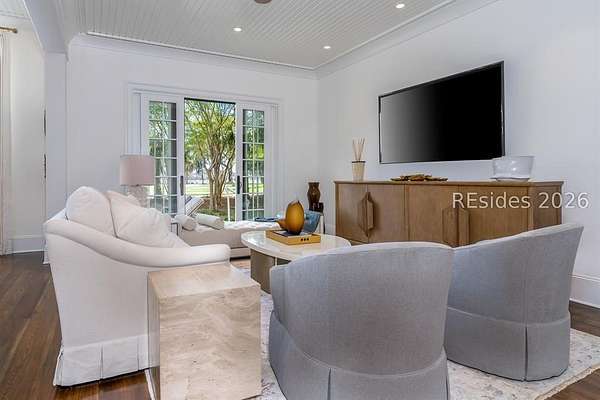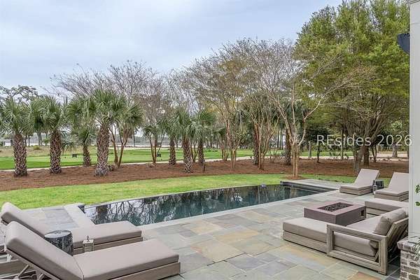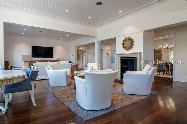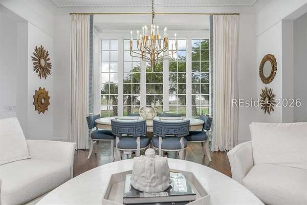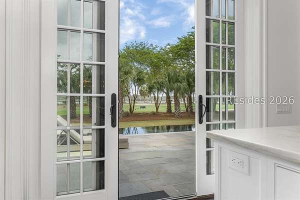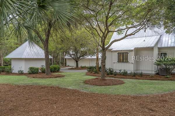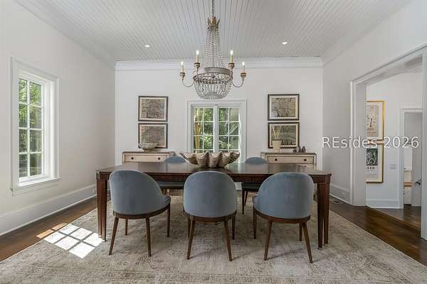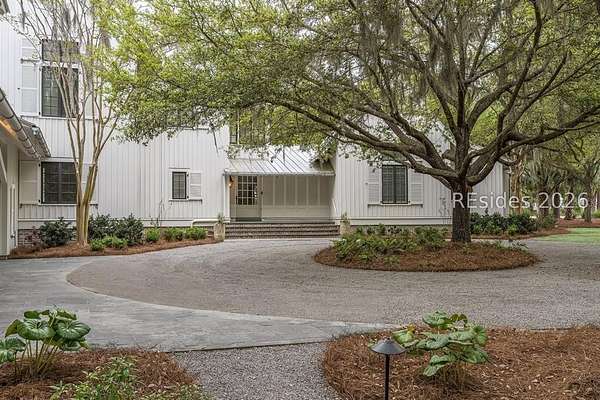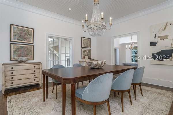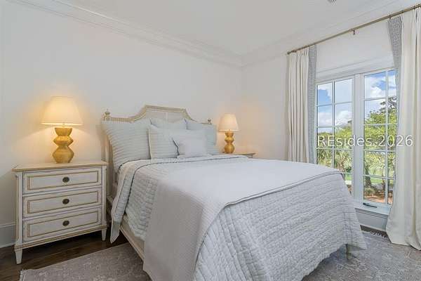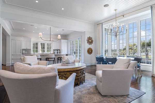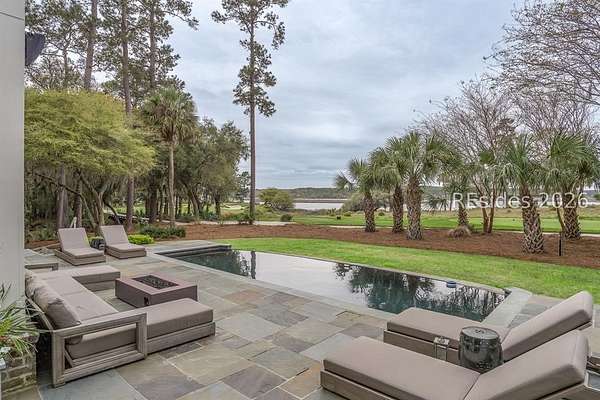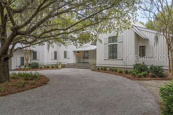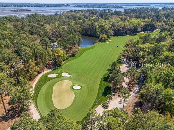 With its expansive acreage and private bridge approach, 26 Plum Thicket Road offers a rare sense of arrival and seclusion within Palmetto Bluff. Overlooking the iconic par-3 14th hole of the May River Golf Course, the home captures sweeping views from tee to green to the May River beyond, with the 13th hole framing the surrounding landscape. Designed by renowned architect Bobby McAlpine, the residence blends timeless Lowcountry architecture with refined craftsmanship. Pine floors with bluestone accents, custom built-ins, and intricate trim detail define the interiors, creating a home that is both elegant and inviting. Recently renovated, the property has been thoughtfully updated with a full interior and exterior repaint, new kitchen appliances including Wolf and Sub-Zero, custom lighting, and select structural enhancements. The 7-bedroom compound offers exceptional flexibility, with four bedrooms in the main residence, a two-bedroom guest house, and a private suite above the three-car garage. Indoor living spaces transition seamlessly to expansive outdoor areas, including a rear pool, grilling station, and screened porch-all positioned to take in the panoramic golf-to-river views. Offered fully furnished, this is a true legacy property-combining privacy, architectural pedigree, and one of the most coveted vantage points in Palmetto Bluff.