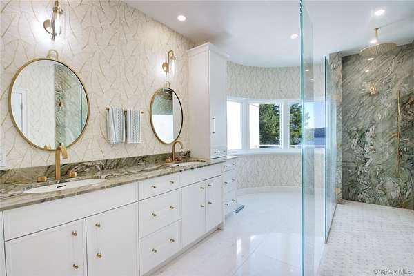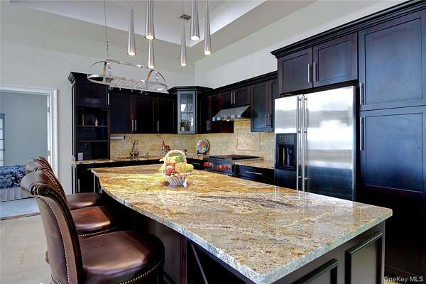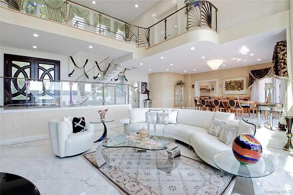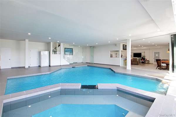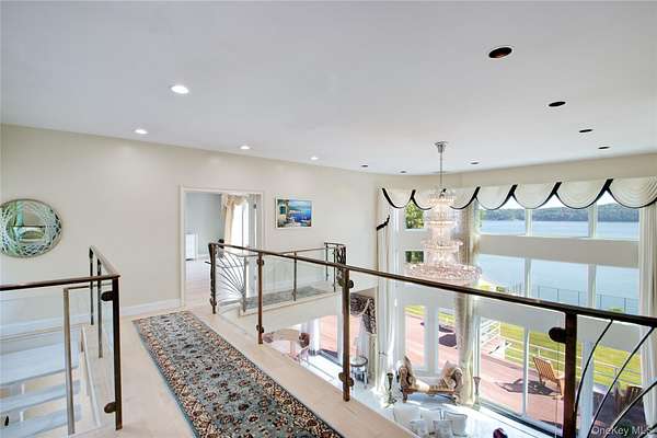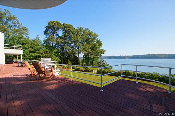 Experience the ultimate in waterfront living with this extraordinary 9,000+ sq. ft. estate set on two sweeping acres with 200 feet of private shoreline in Oyster Bay. Designed for both grand entertaining and everyday comfort, the residence offers 5 bedrooms, 6.5 baths, and 4 fireplaces, all supported by modern essentials including a full-house generator and security system. Step inside the dramatic entry foyer where light and space unfold into expansive living areas with floor-to-ceiling windows framing panoramic water views. The main level is highlighted by a sophisticated living room, formal dining room, and a versatile lounge/meeting space. A library with its own bath provides a perfect retreat or guest option. The chef's kitchen impresses with granite counters, custom cabinetry, professional appliances including three ovens and two dishwashers, and an adjoining laundry/mudroom. A spectacular 1,600 sq. ft. great room with a wet bar and wood-burning fireplace anchors the first floor. Upstairs, three ensuite bedrooms each open to private balconies overlooking the water. The primary suite is a true sanctuary featuring a fireplace, spa bath with dual vanities, and an oversized walk-in dressing closet. Outdoor living is elevated with more than 1,800 sq. ft. of wraparound decking, a tennis court, gazebo, and direct water access for kayaking, jet skiing, and more. The lower level extends the lifestyle with an indoor pool and hot tub, an entertainment space with wet bar, a full guest suite with private entrance, abundant storage, and a 4+ car garage. With meticulous craftsmanship and unparalleled amenities inside and out, this residence is not just a home-it's a private waterfront resort.
